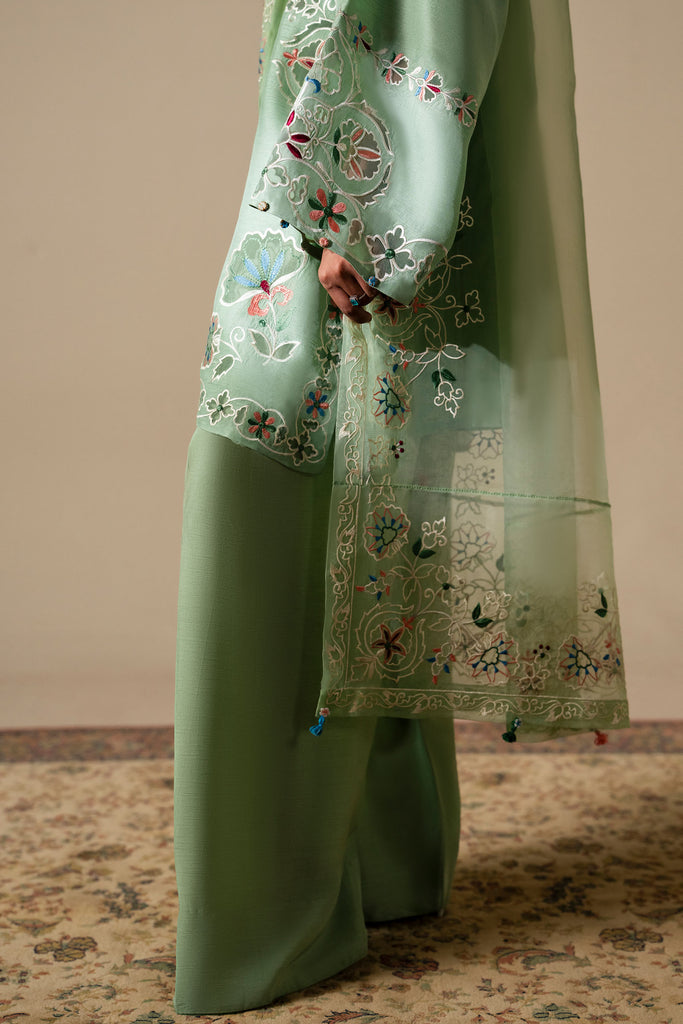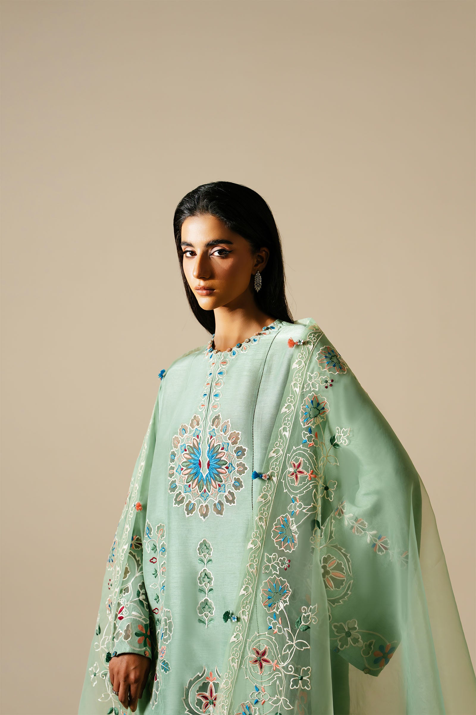 An ode to effortless sophistication, Caelina unfolds on a cool mint raw silk canvas — a vision of calm elegance and refined artistry. Delicate tribal-inspired motifs bloom across the front in shades of peach, red, and soft blue, their intricate embroidery and laser-cut details lending depth and quiet grandeur. Subtle thread tassels and button-detailed sleeves add a graceful charm, while the farshi shalwar brings movement and tradition into perfect harmony. Paired with an organza dupatta adorned with softly composed tribal florals, Caelina stands as a statement of classic beauty — serene, graceful, and eternally timeless.