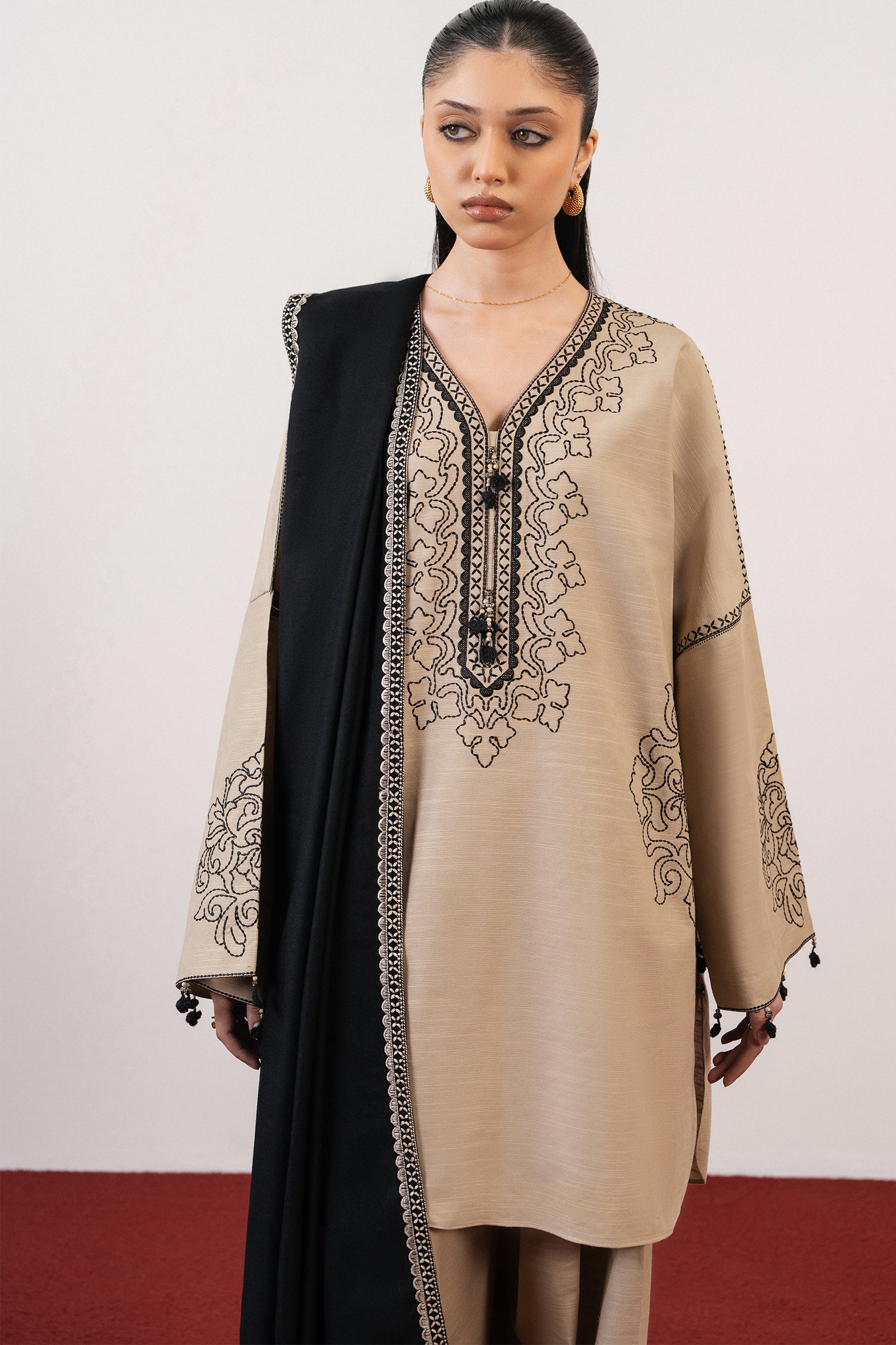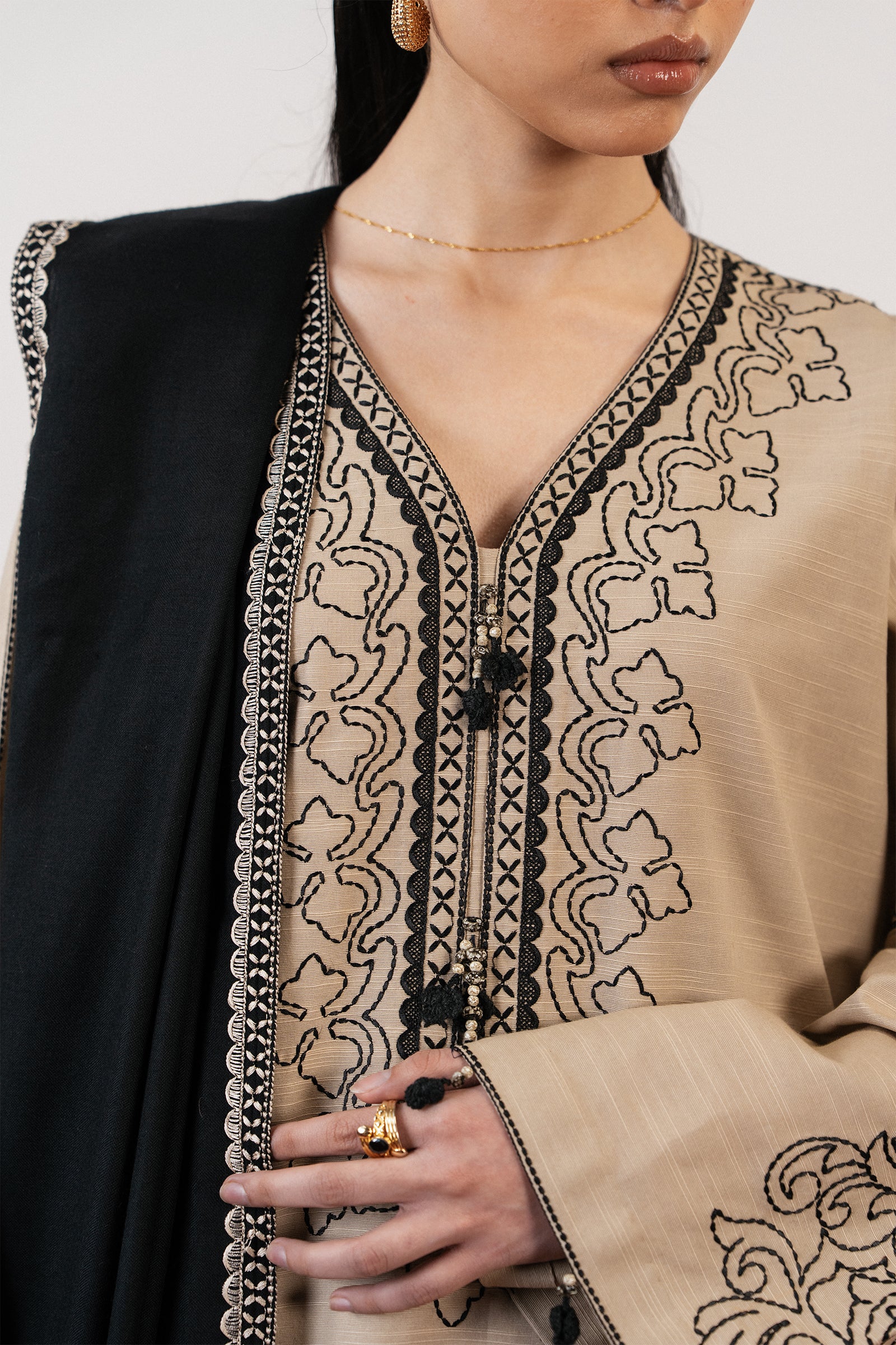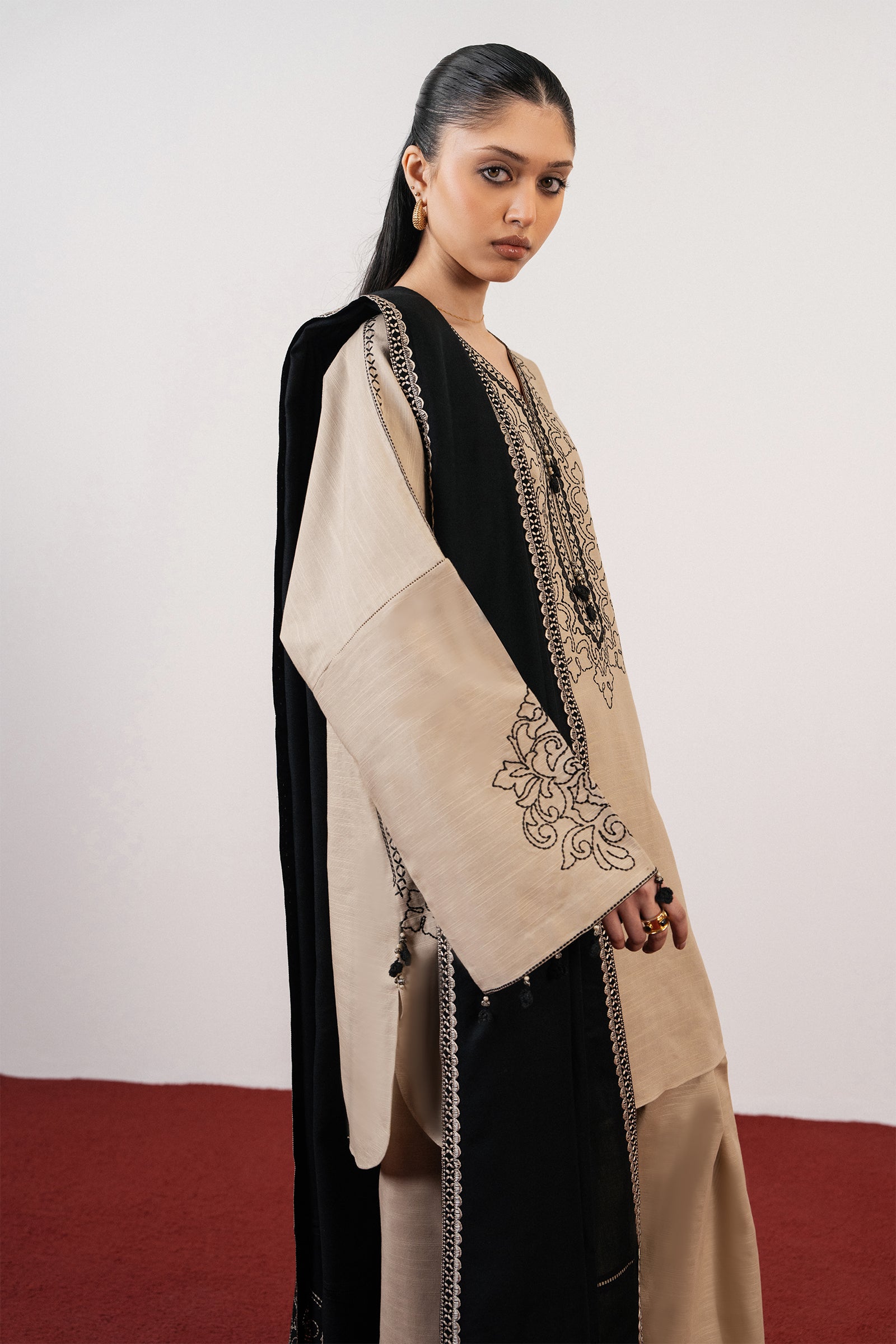 FÉRA — defined by quiet drama, this ensemble unfolds in soft beige, anchored by striking black embroidery tracing the neckline and sleeves with artisanal precision. The relaxed kurta silhouette flows with ease, layered for winter warmth without losing its structured grace.