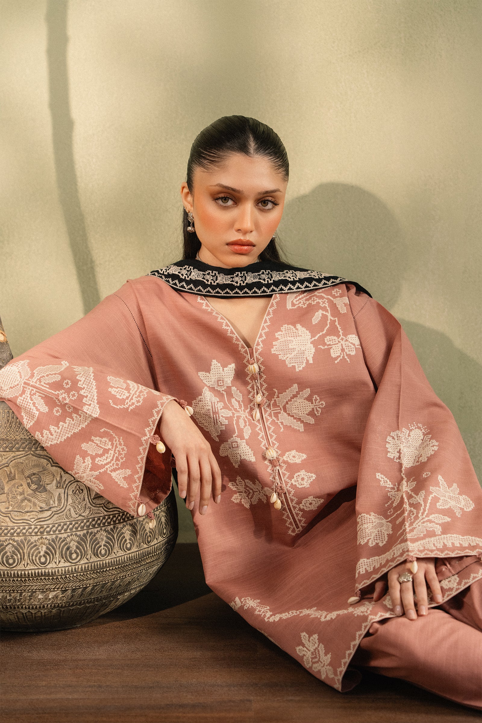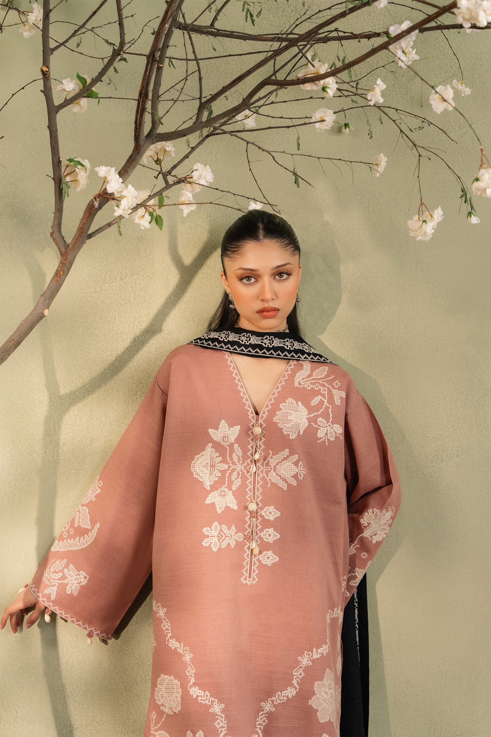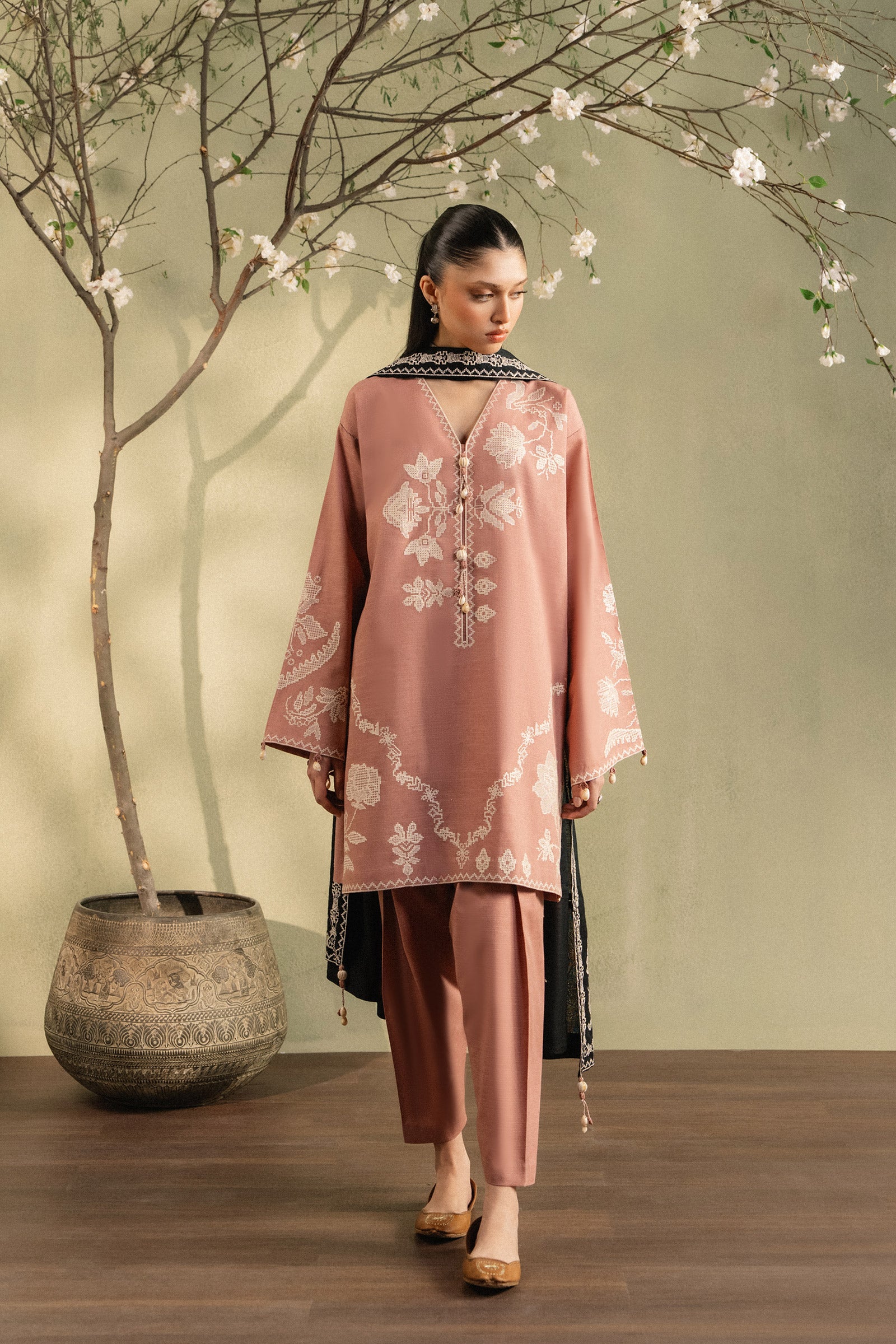 MARÉA — bathed in soft blush tones, this ensemble embodies warm winter elegance with artisanal grace. Delicate ivory embroidery blooms organically across the kurta’s front and sleeves, while a clean neckline enhances the relaxed, fluid silhouette.