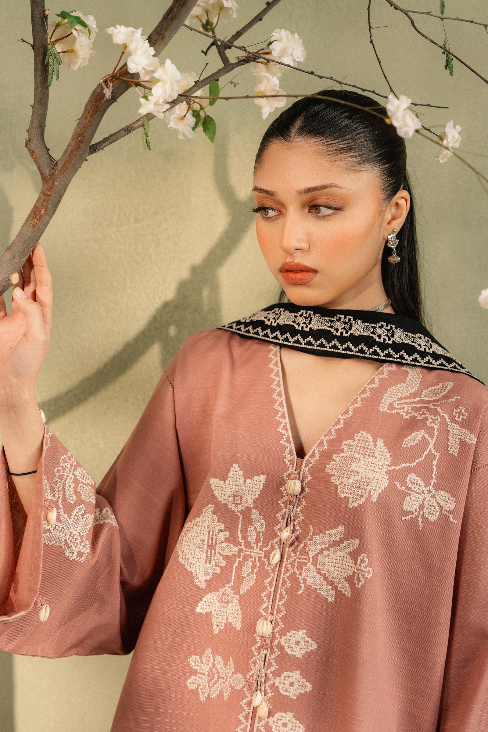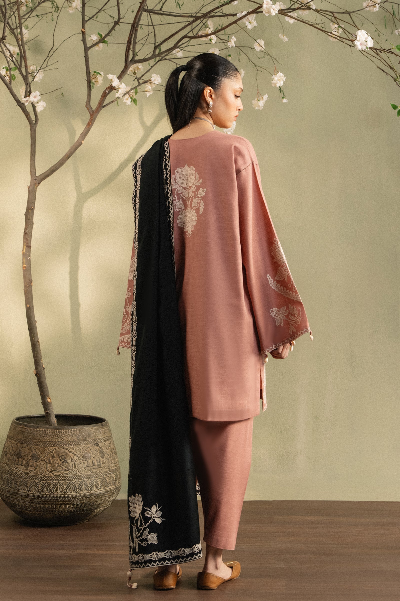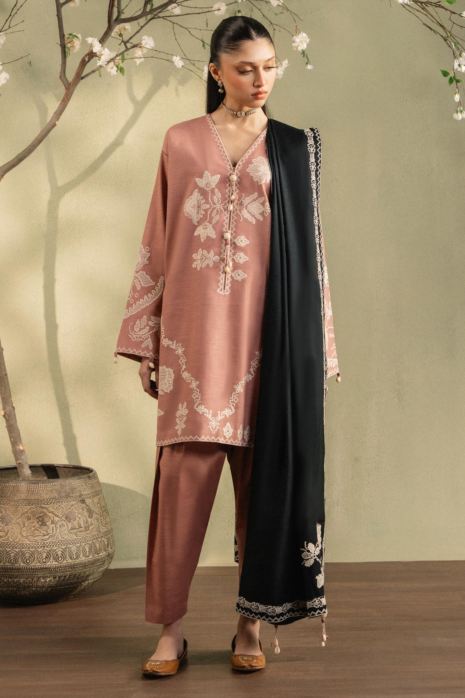 MARÉA — bathed in soft blush tones, this ensemble embodies warm winter elegance with artisanal grace. Delicate ivory embroidery blooms organically across the kurta’s front and sleeves, while a clean neckline enhances the relaxed, fluid silhouette.