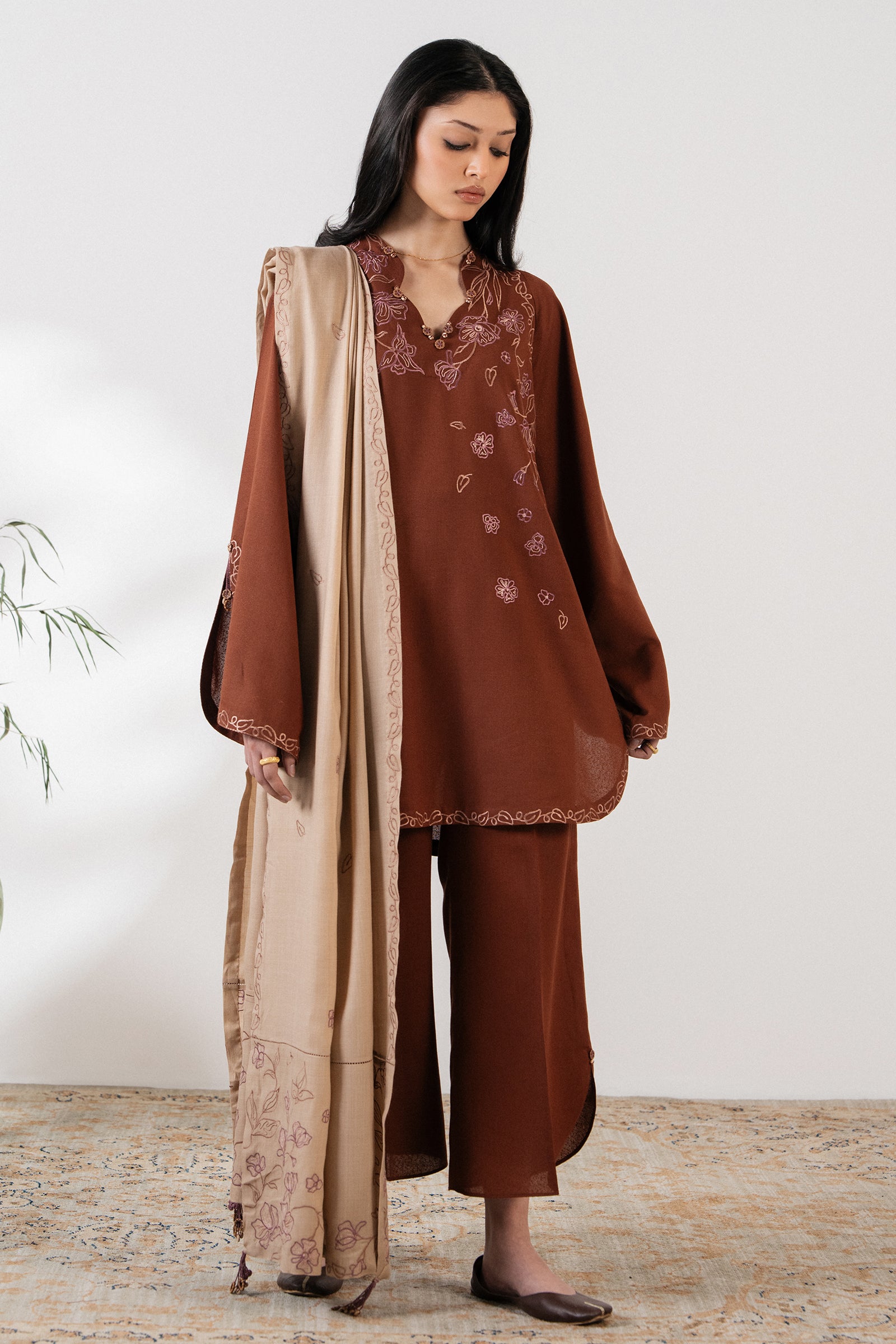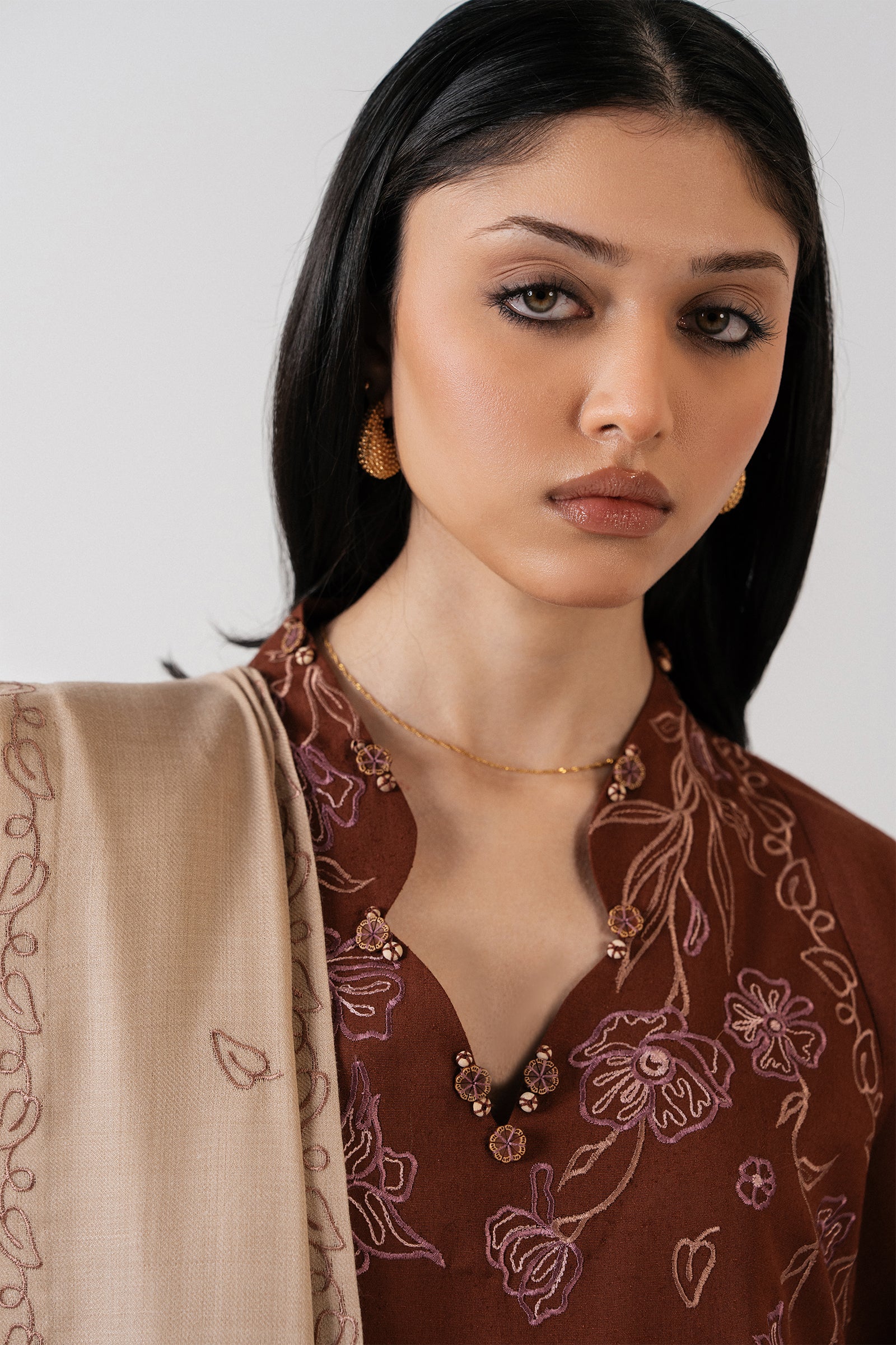 MEHR — Rust-brown two-piece with delicate tonal floral embroidery, relaxed wide-leg trousers, and a soft beige dupatta with ornate border. Minimal, warm, effortlessly refined.