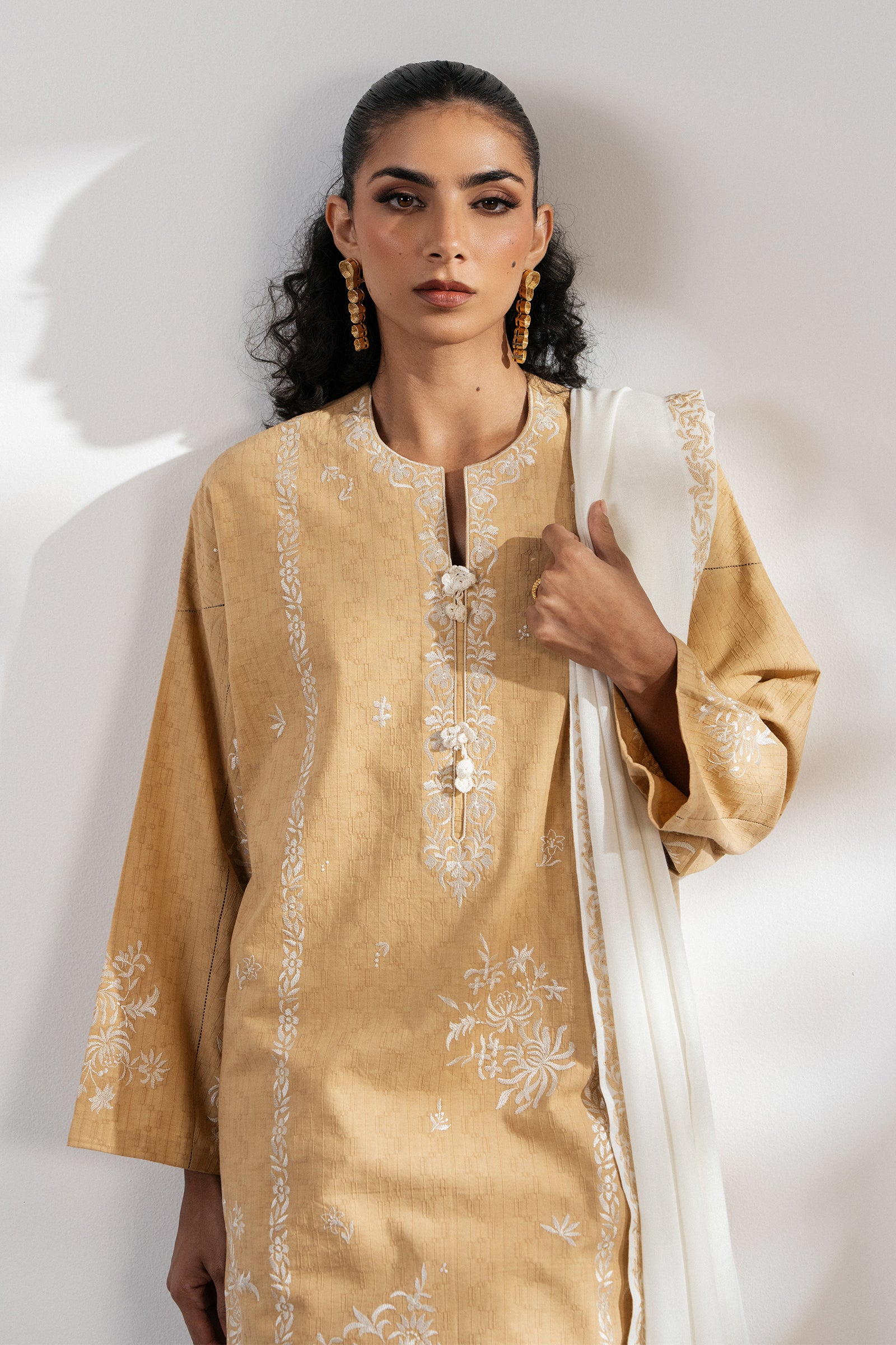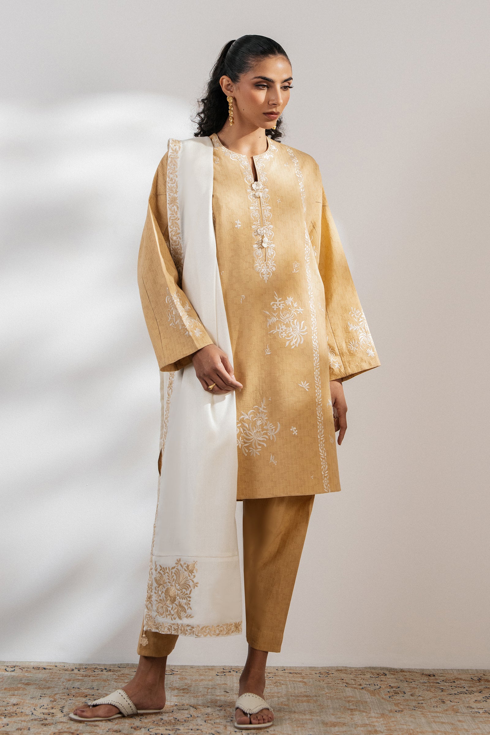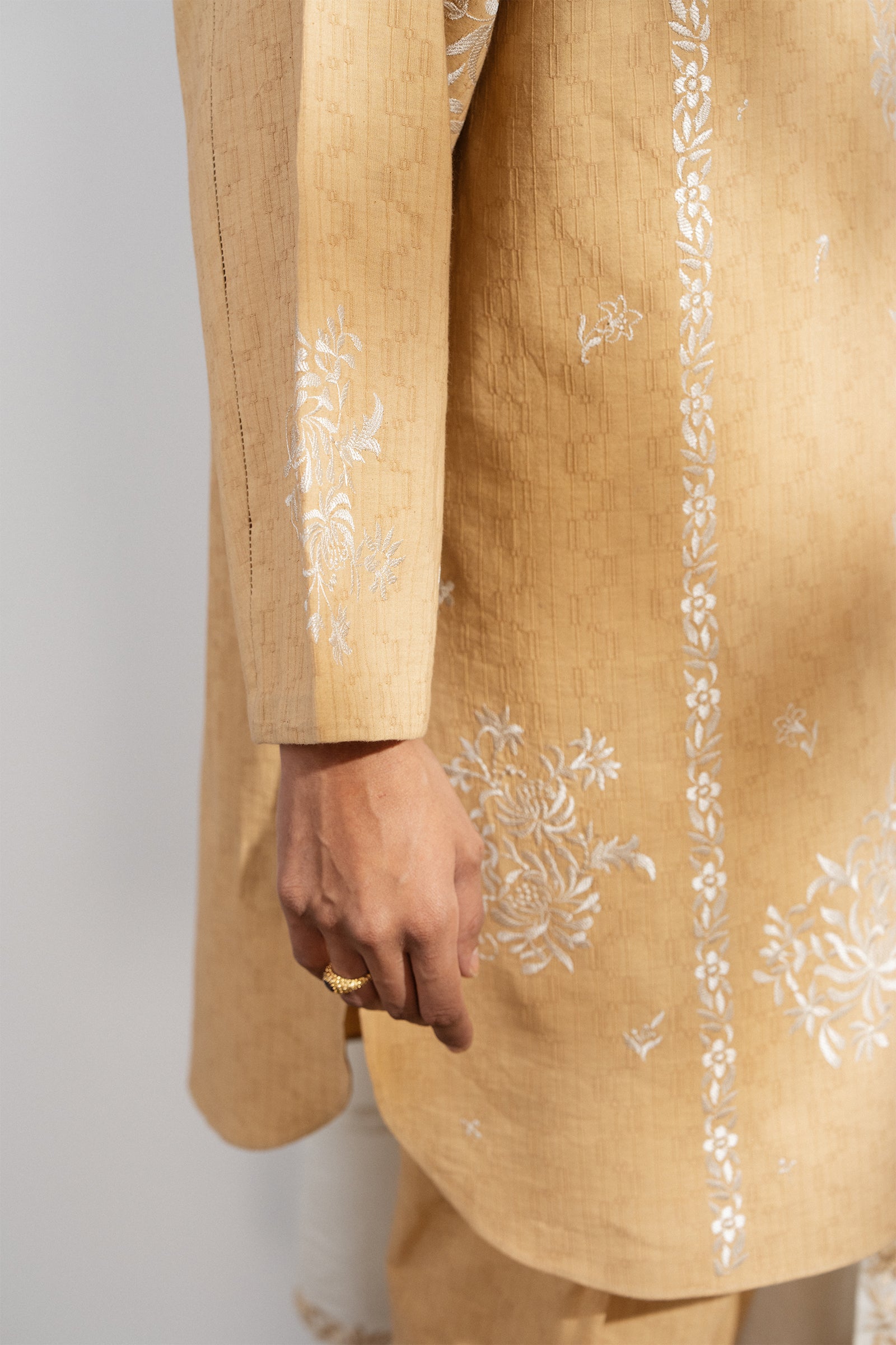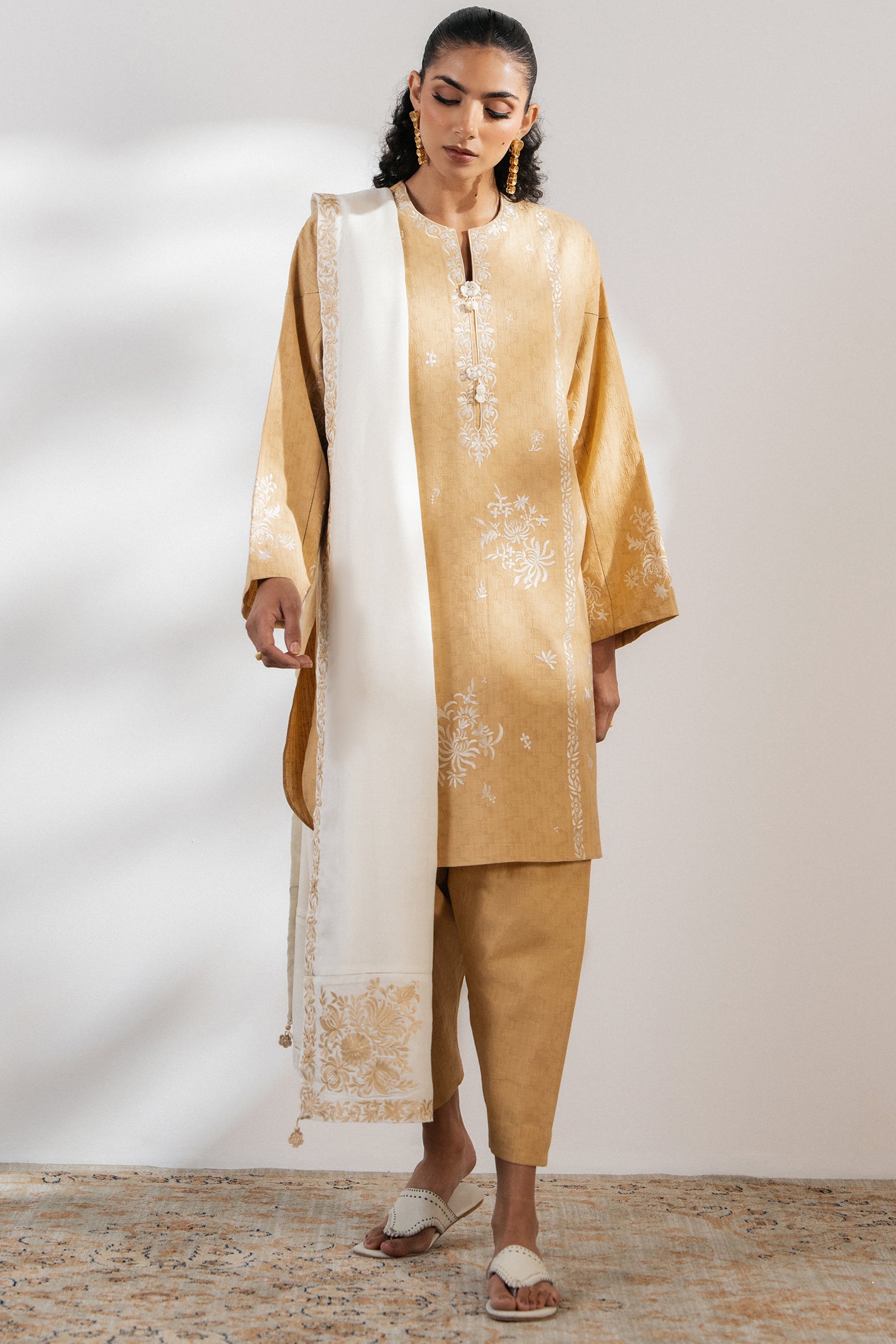 MÓRA — bathed in warm mustard tones, this ensemble evokes quiet winter elegance for daytime moments. The straight-cut kurta features soft ivory embroidery blooming gently across textured jacquard, while a refined neckline adds subtle definition. Matching trousers keep the silhouette clean and composed.