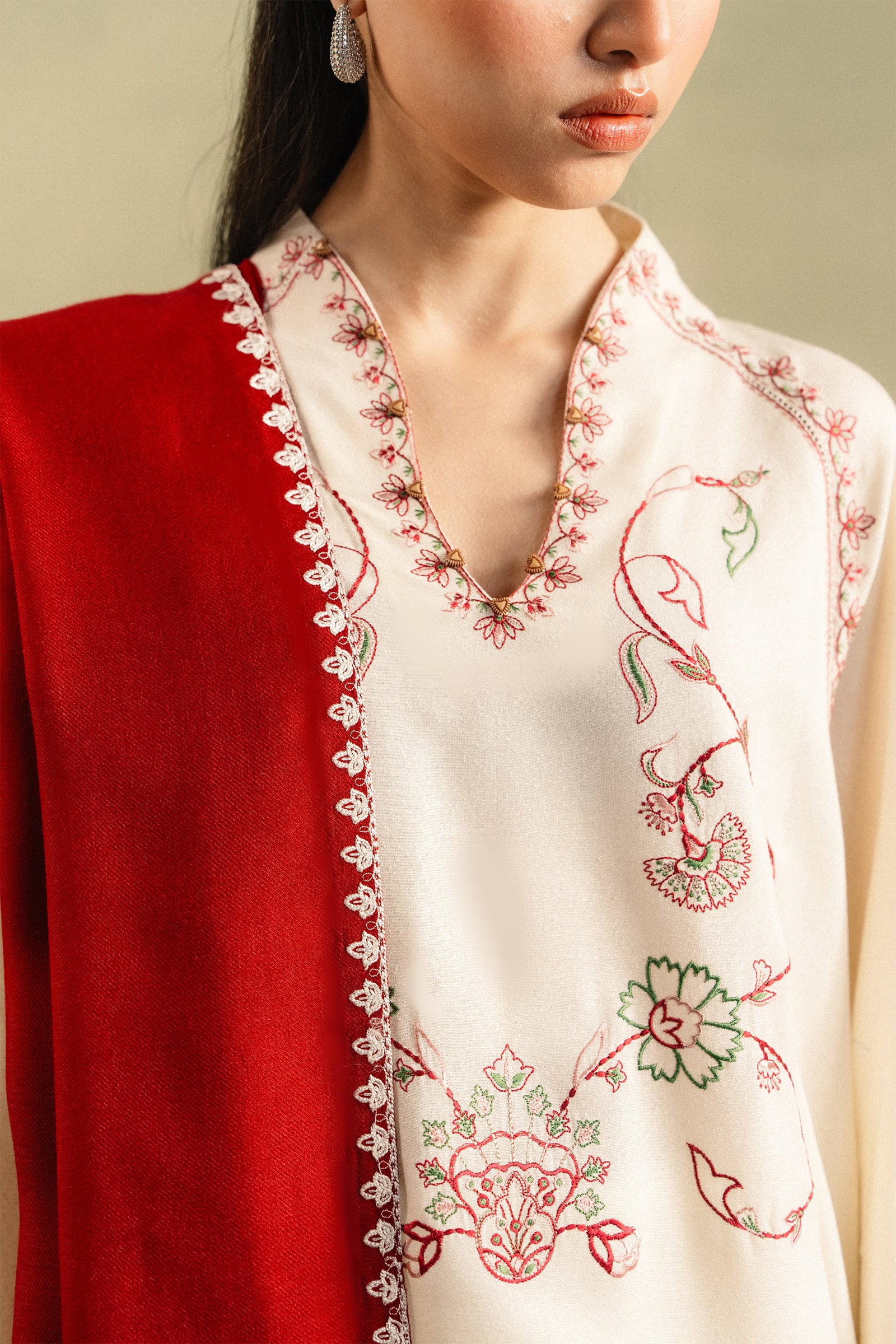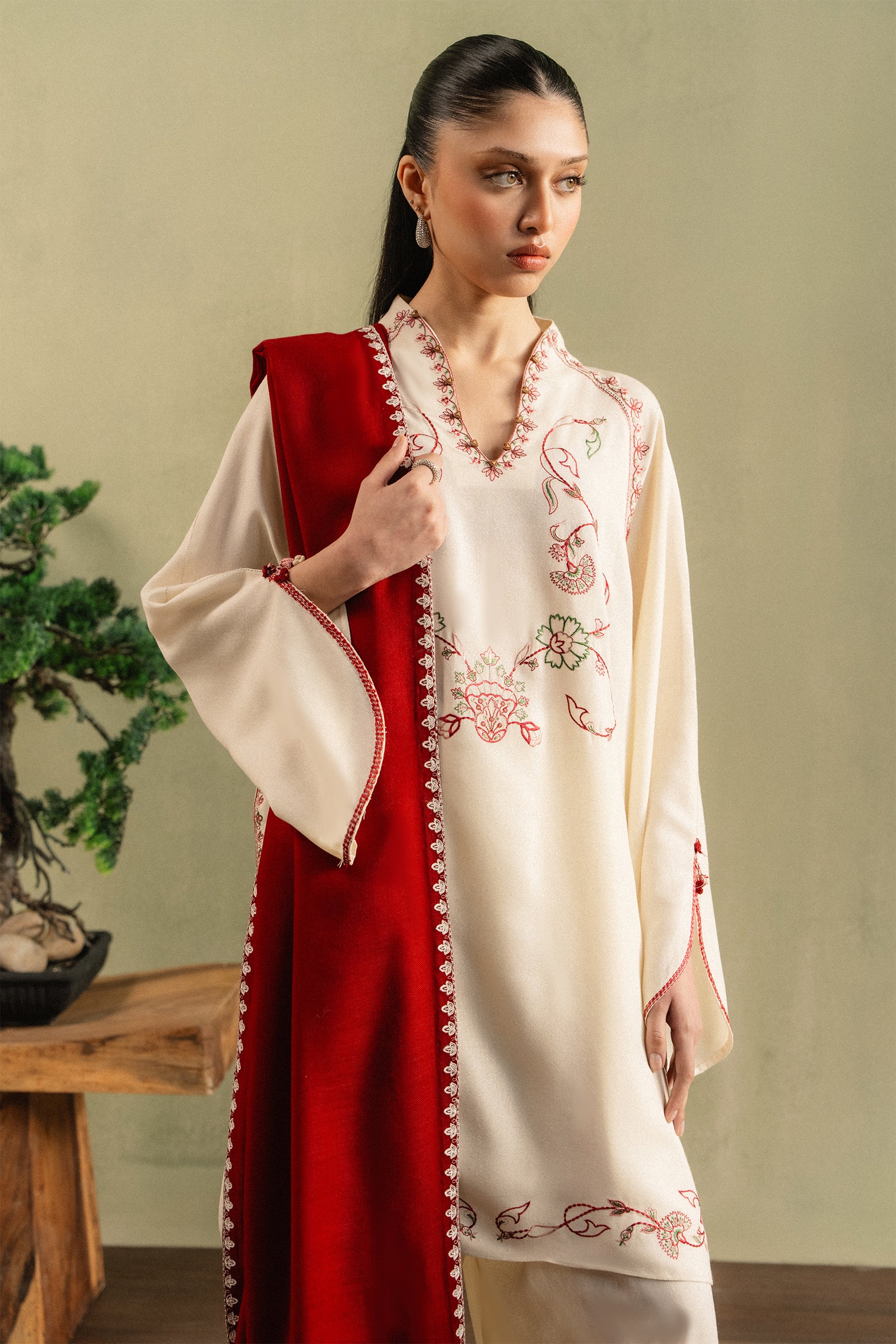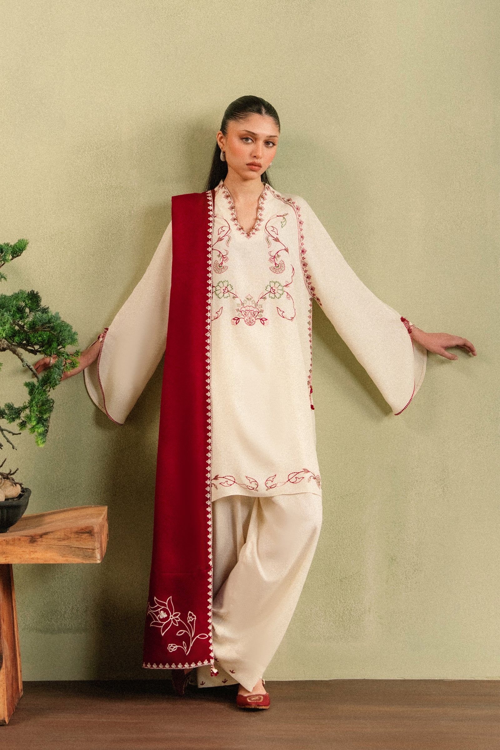 RÓSA — winter softened in porcelain khaddar, its neckline traced with delicate florals in deep maroon, whispered with accents of pink and green. Tulip-shaped sleeves flow like quiet shadows, detailed with subtle hand-stitching. A contrasting maroon dupatta with embroidered borders completes the layered, season-ready silhouette. Minimal, grounded, and quietly powerful.
