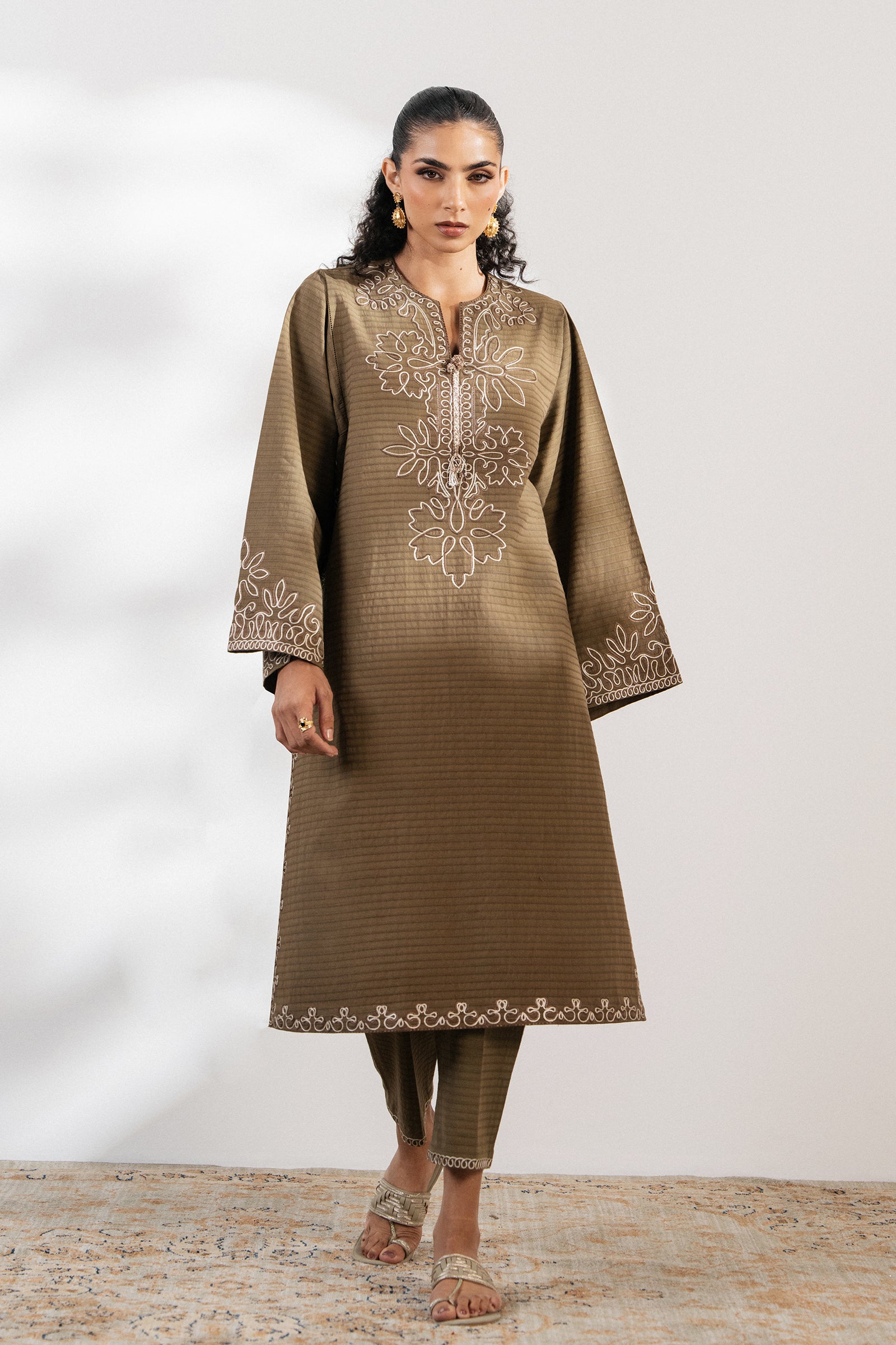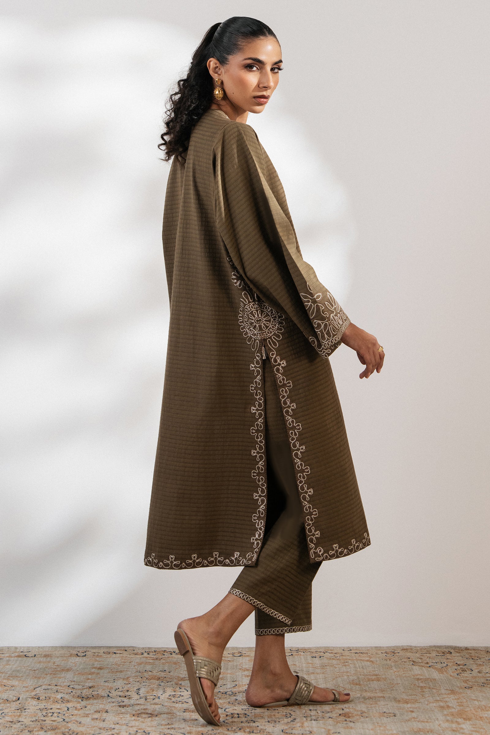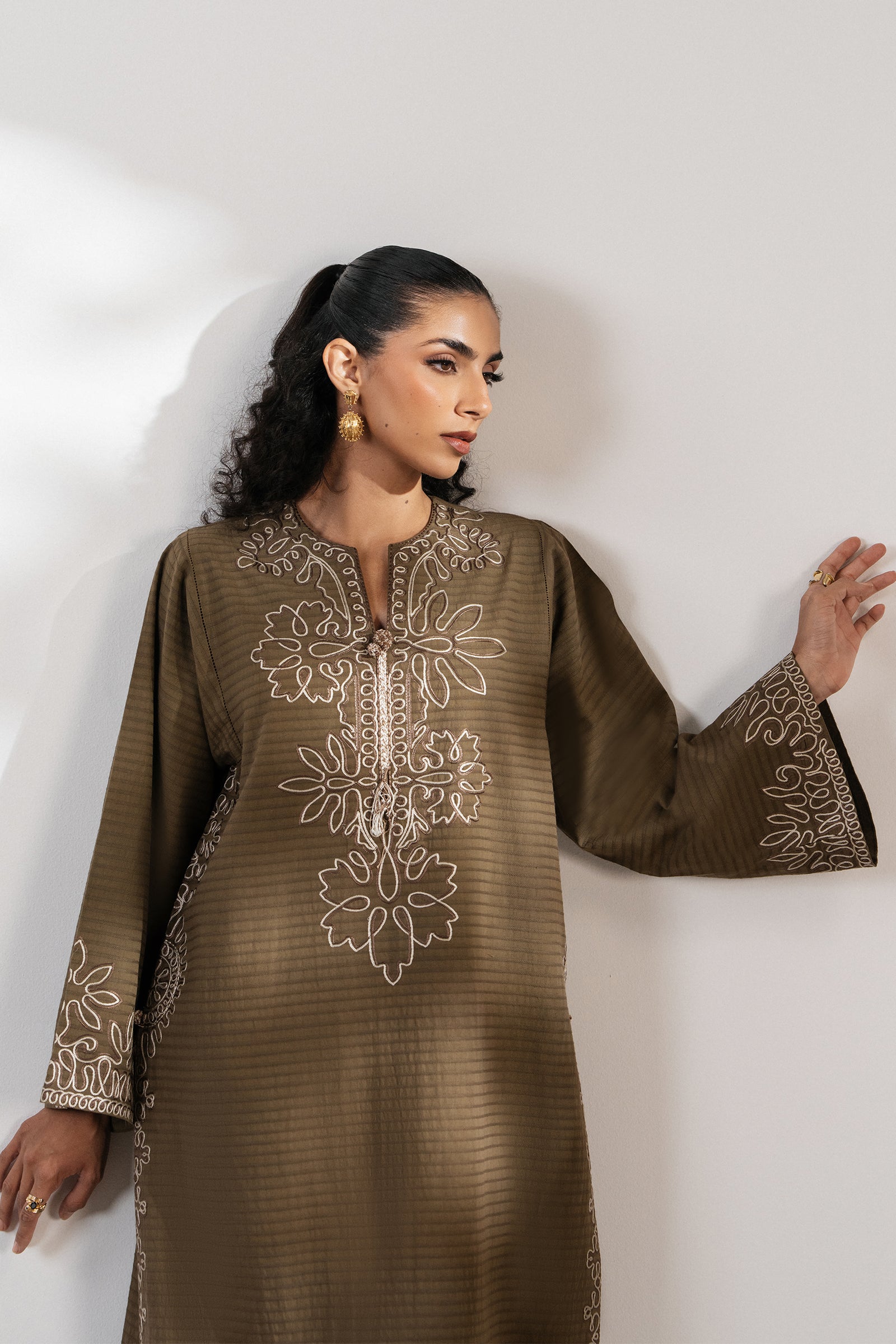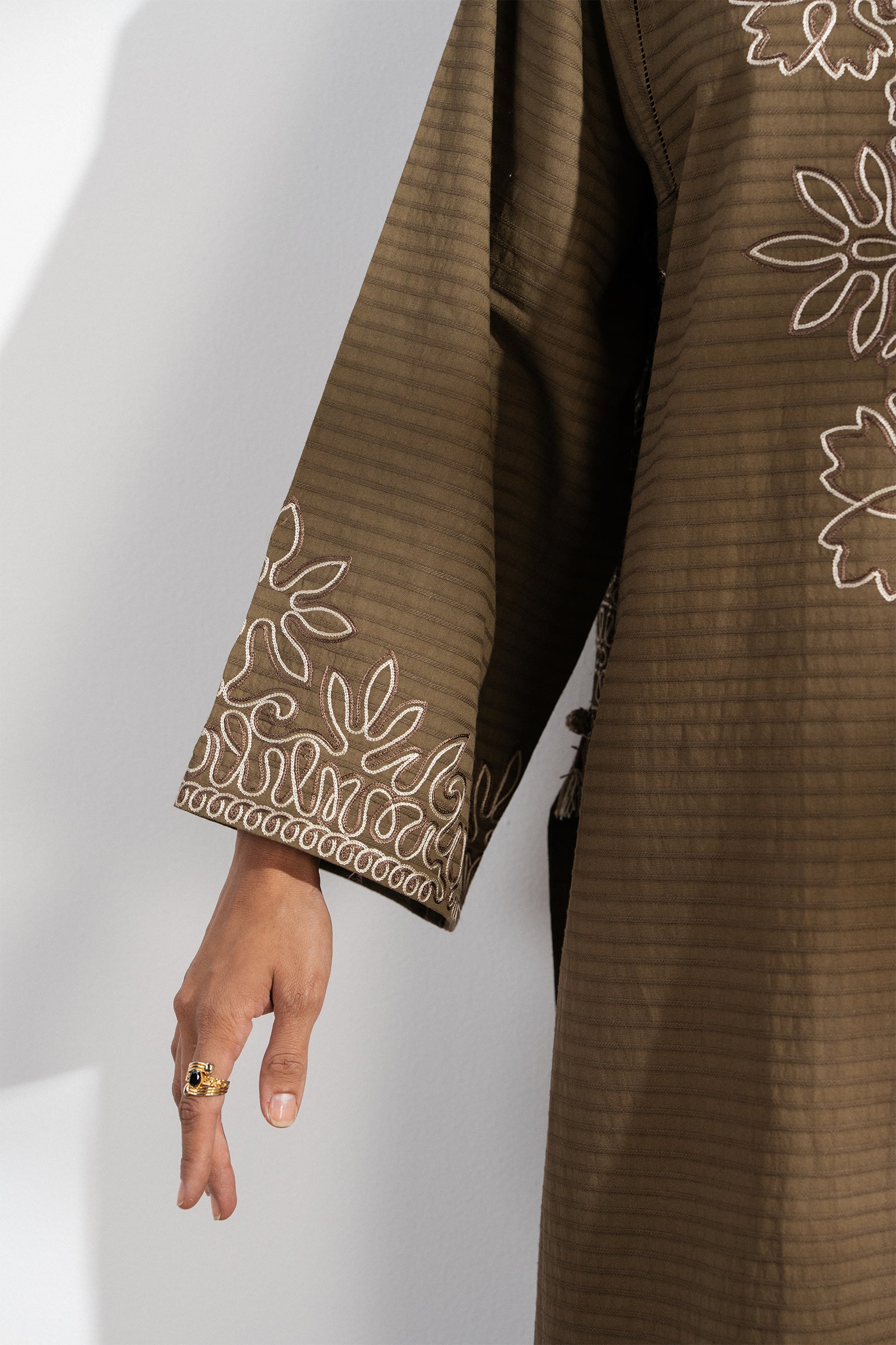 OLVIA — rendered in deep olive, this quietly striking ensemble exudes grounded elegance. Ivory threadwork blooms organically along the neckline and hem, adding delicate, artisanal contrast to the textured jacquard. Relaxed sleeves lend effortless fluidity, completing a composed, winter-ready silhouette.