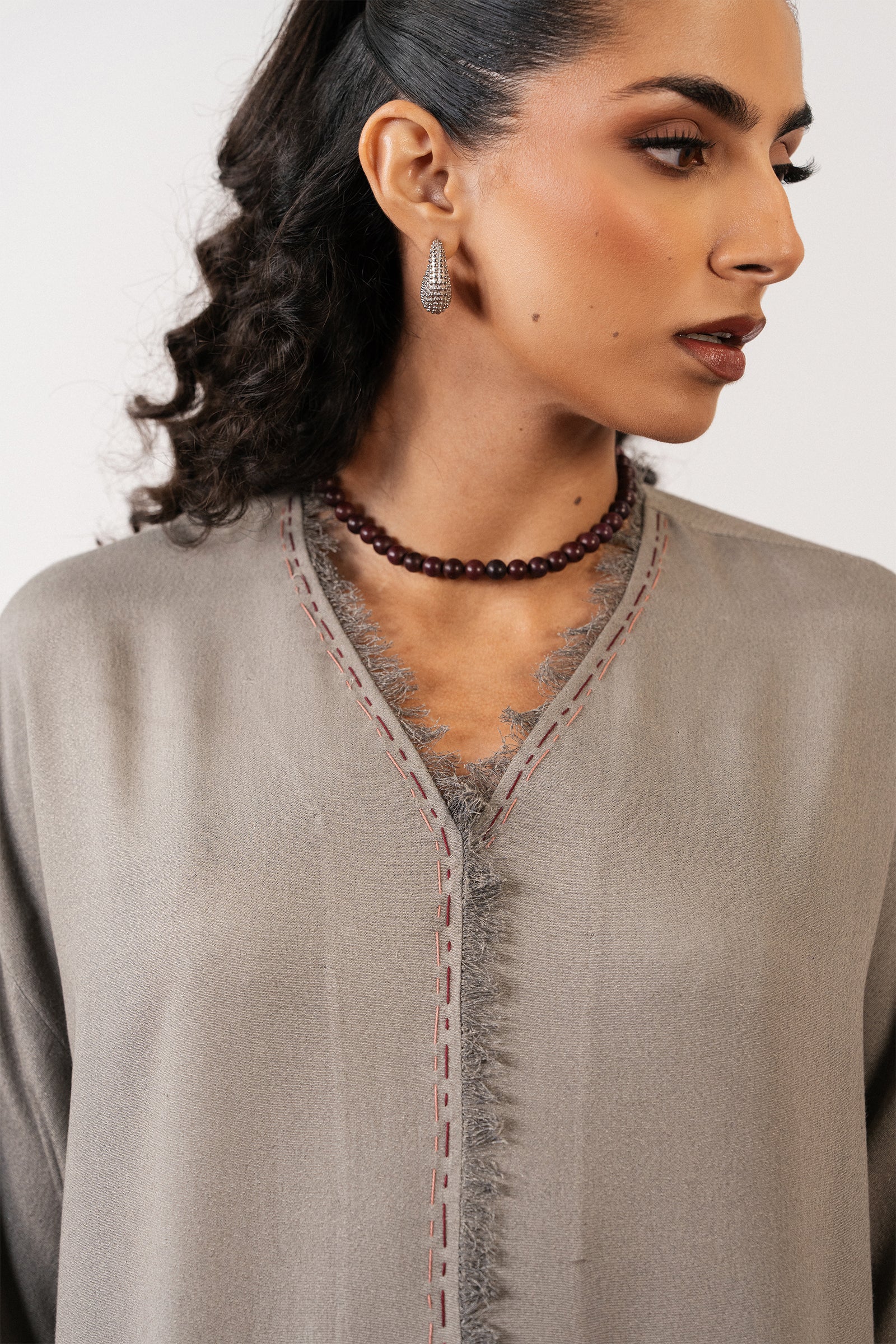 Like a quiet dream settling into winter’s hush, Lumi unfolds in a cloud grey karandi coord — warm, fluid, and gently structured for the colder season. The long, flowing silhouette drapes with effortless ease, offering a cocooned sense of comfort and calm. Delicate hand stitches trace the neckline and sleeves, reflecting thoughtful craftsmanship and subtle winter detail.