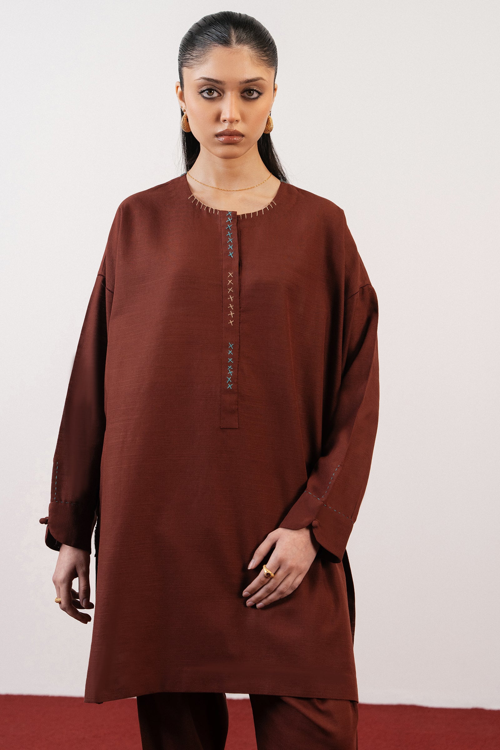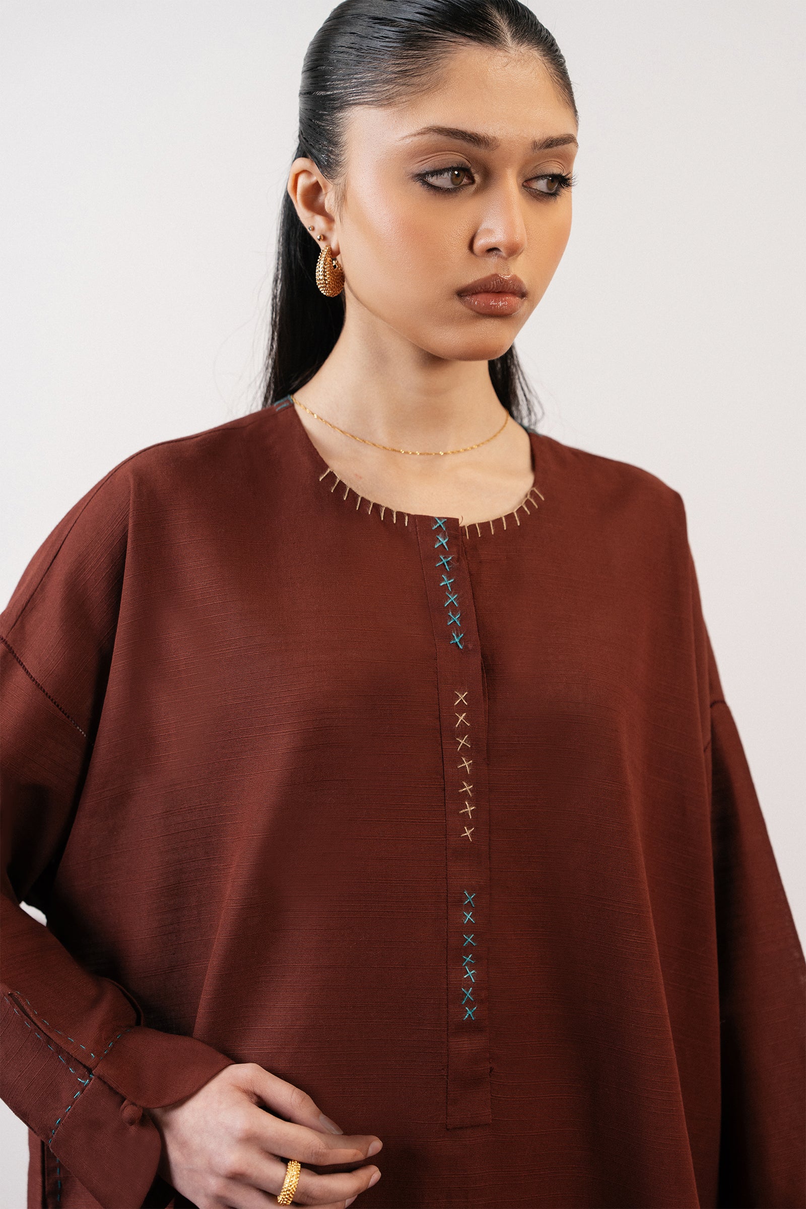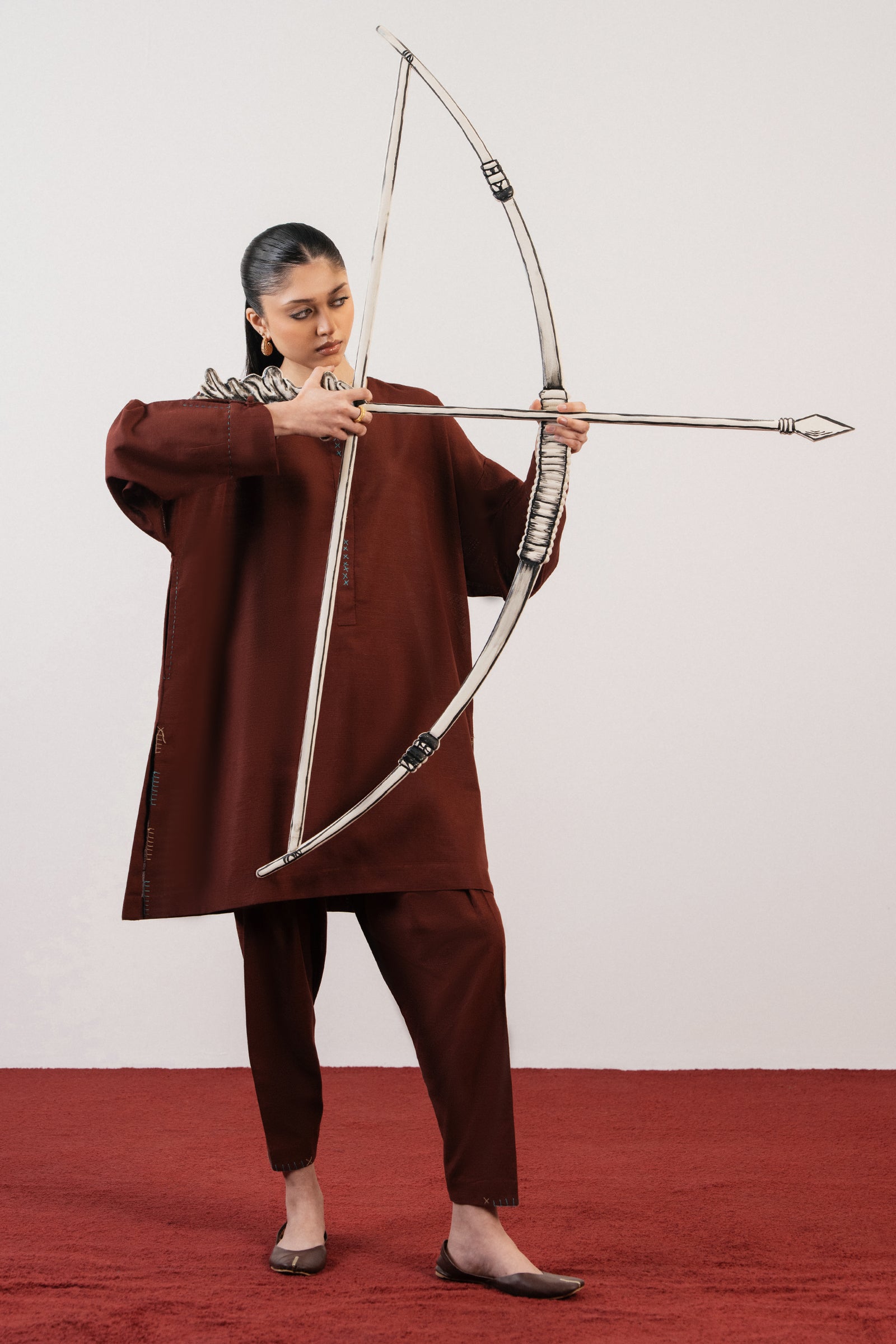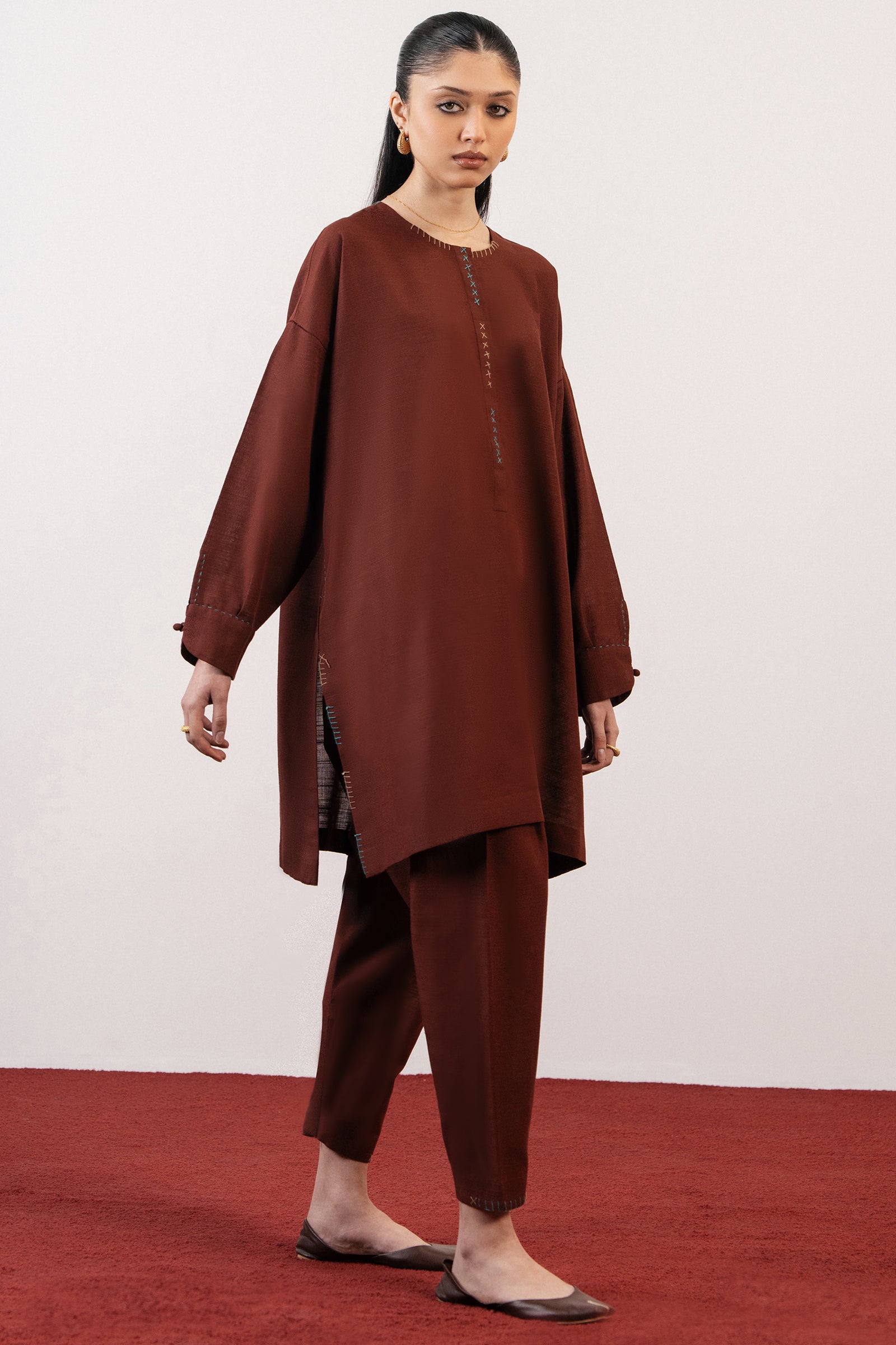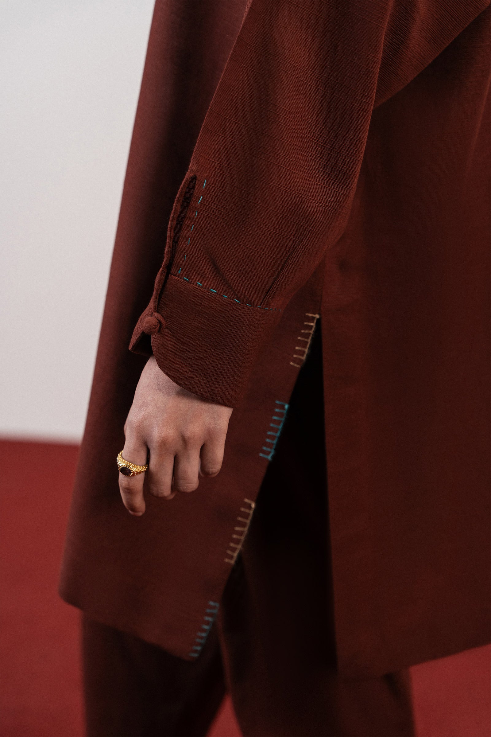 SILA — Deep maroon brown two-piece with a relaxed-fit kurta, subtle button detailing, and tapered trousers. Minimal, warm, effortlessly elegant.