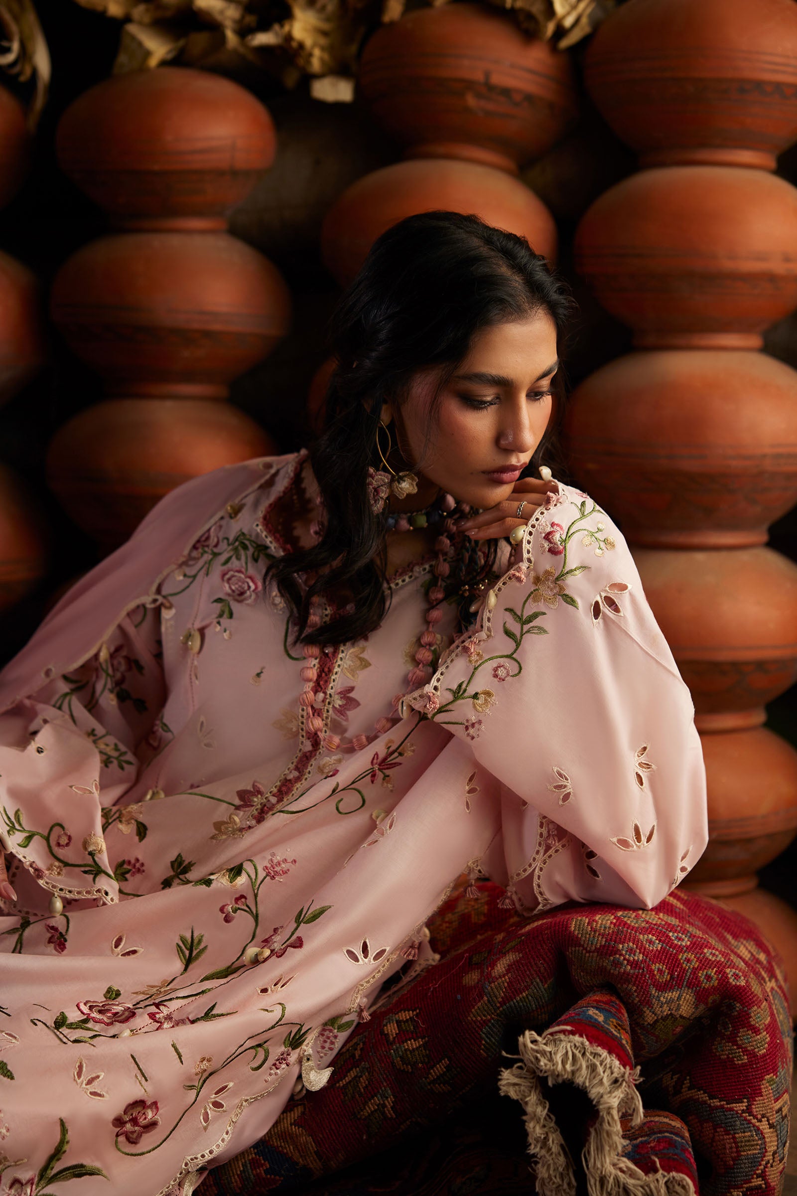 A romantic blush ensemble that blooms with refined femininity. The soft rose-pink canvas is adorned with intricate floral embroideries in crimson, sage, and ivory, unfolding gracefully across the silhouette. Delicate cutwork and scalloped edges frame the hem and sleeves, adding artisanal texture and charm