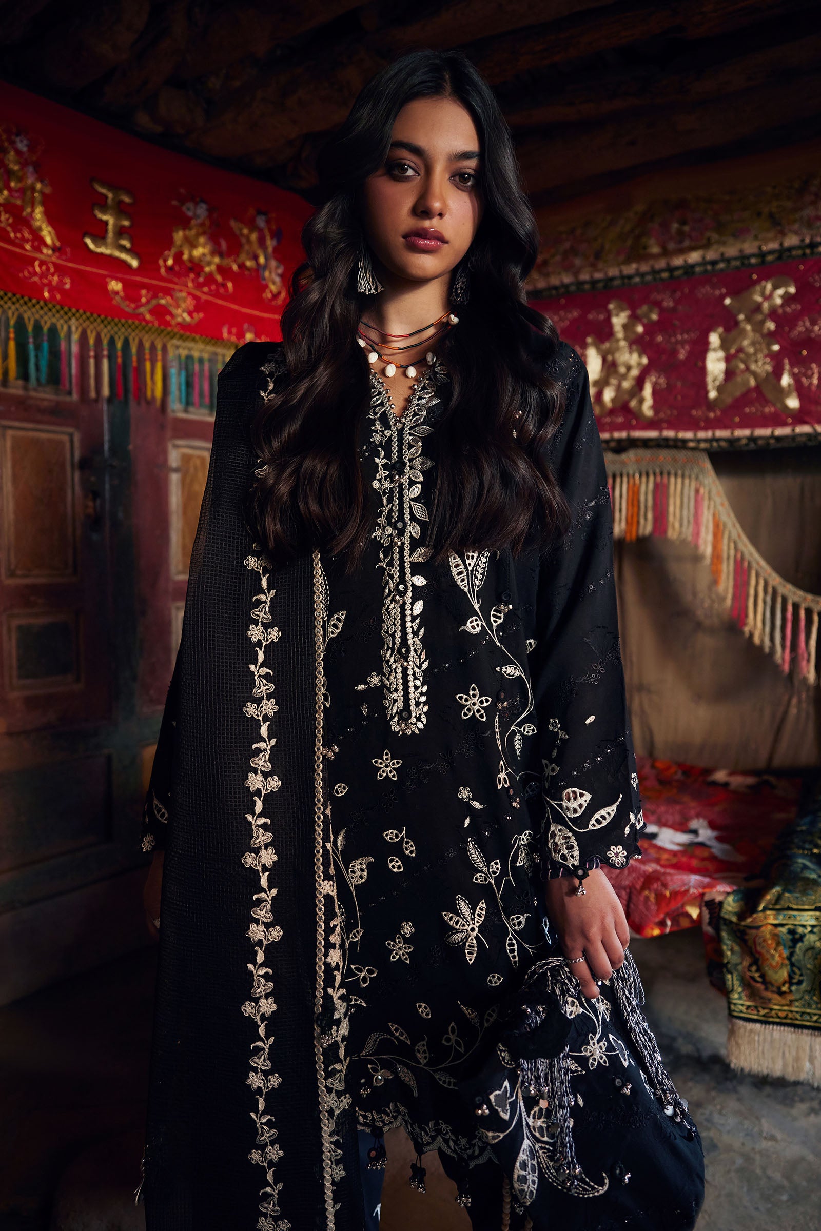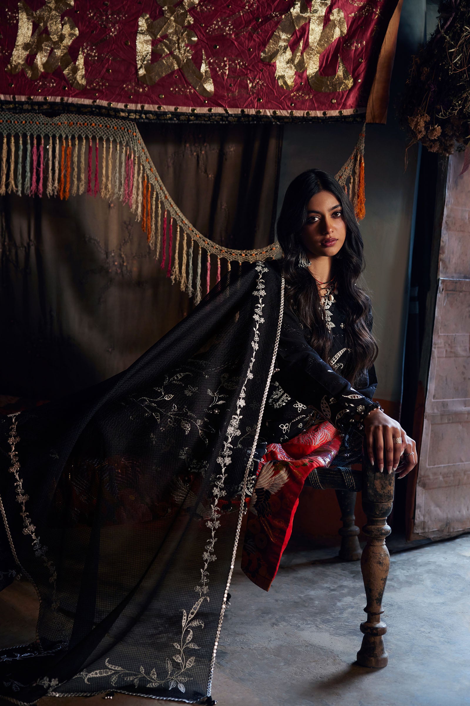 Coordinating trousers feature embroidered cuff accents, while a diaphanous dupatta flows effortlessly, framed with detailed borders and floral embroideries that mirror the ensemble’s ornate narrative.