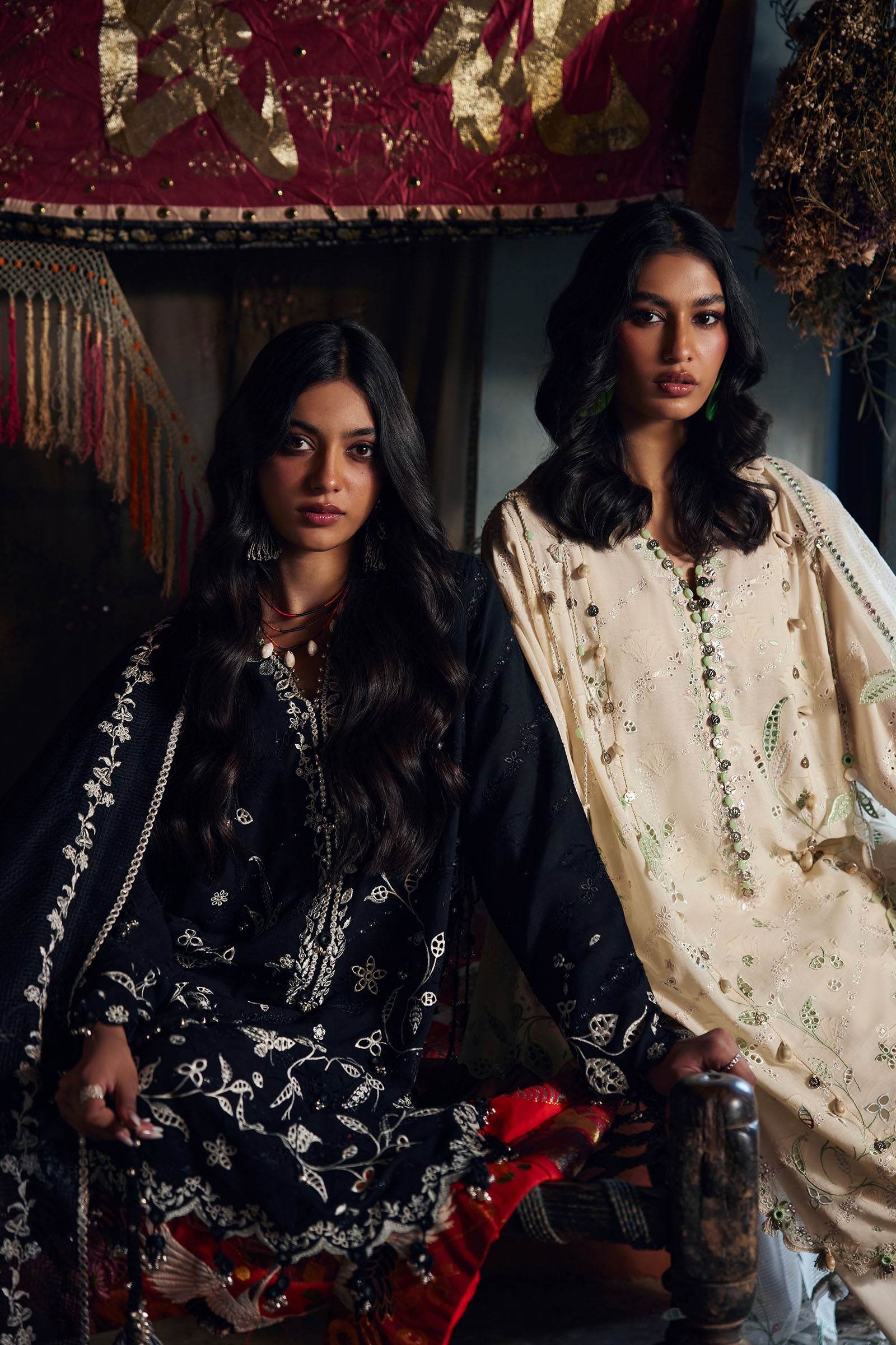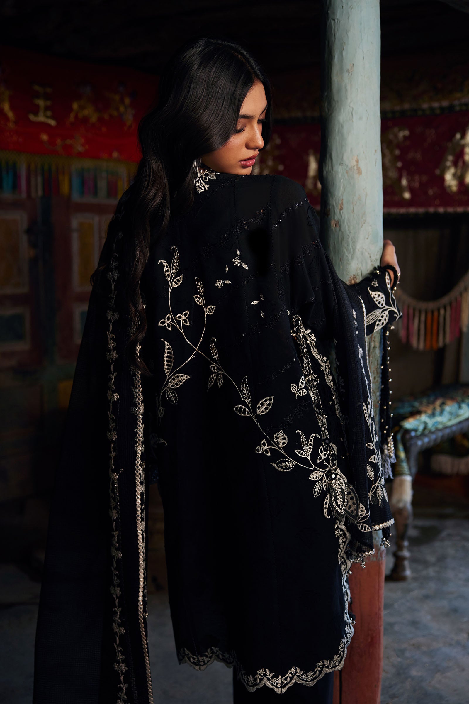 An ode to understated elegance, this inky noir ensemble is a study in refined contrast. The elongated shirt is adorned with delicate ivory floral embroideries, tracing the neckline, sleeves, and hem with poetic precision, echoing heritage artistry reimagined for modernity.