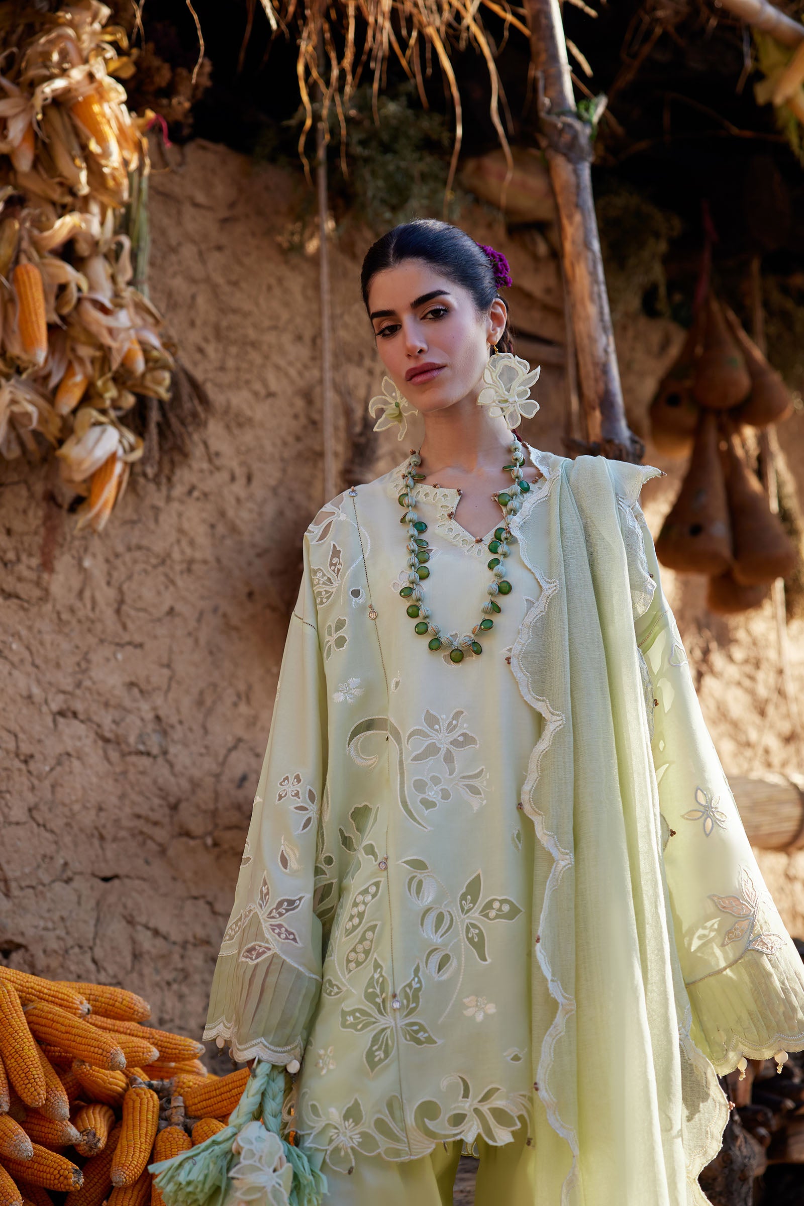 Paired with a textured cotton net dupatta in the same soft lime tone, the look feels light, graceful, and quietly radiant.
