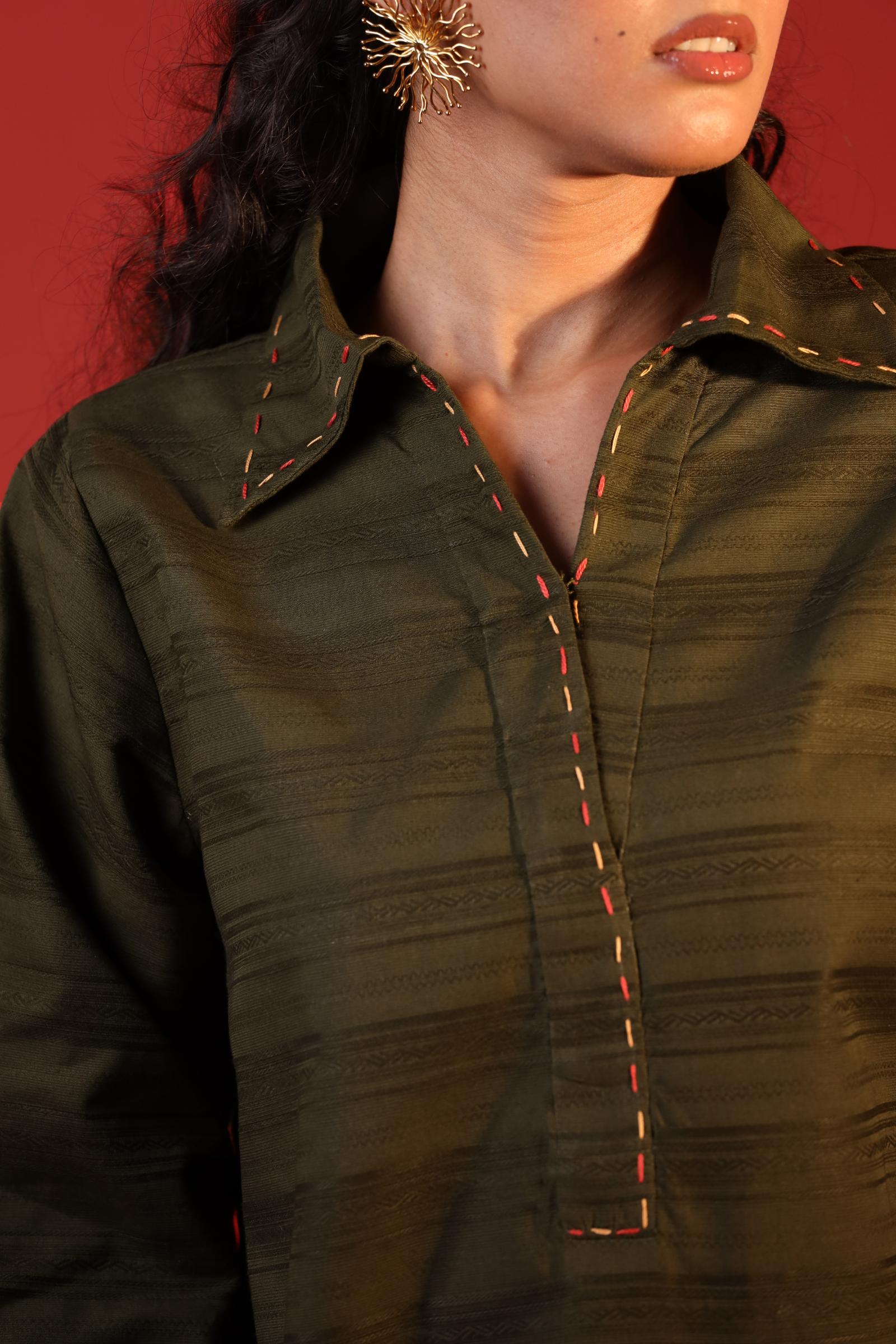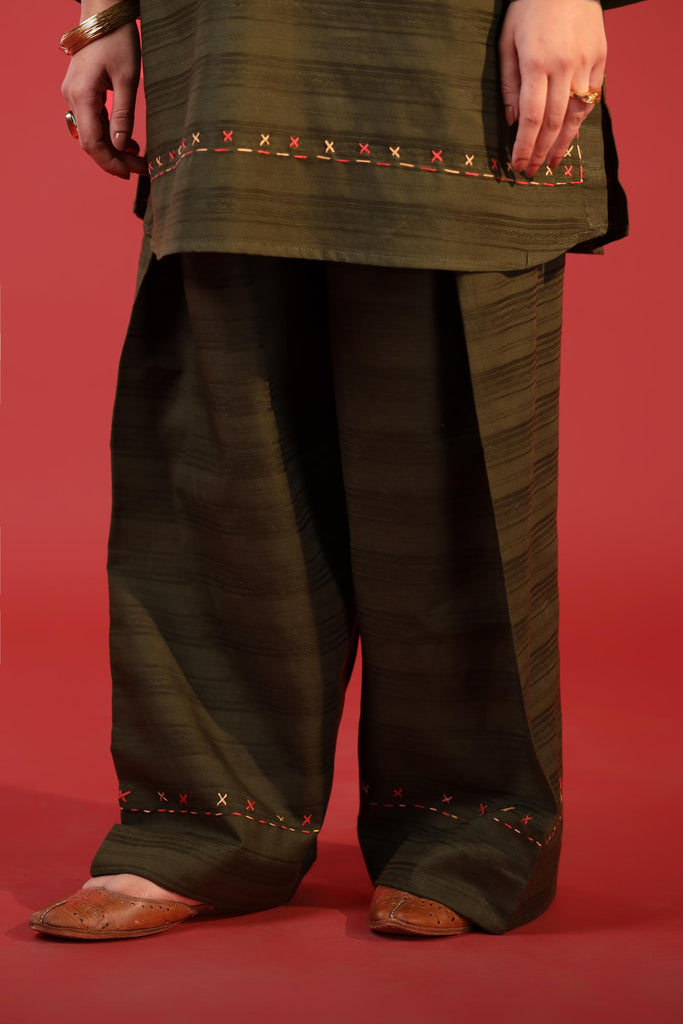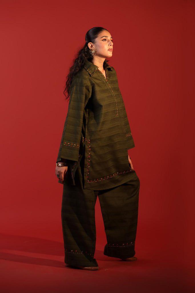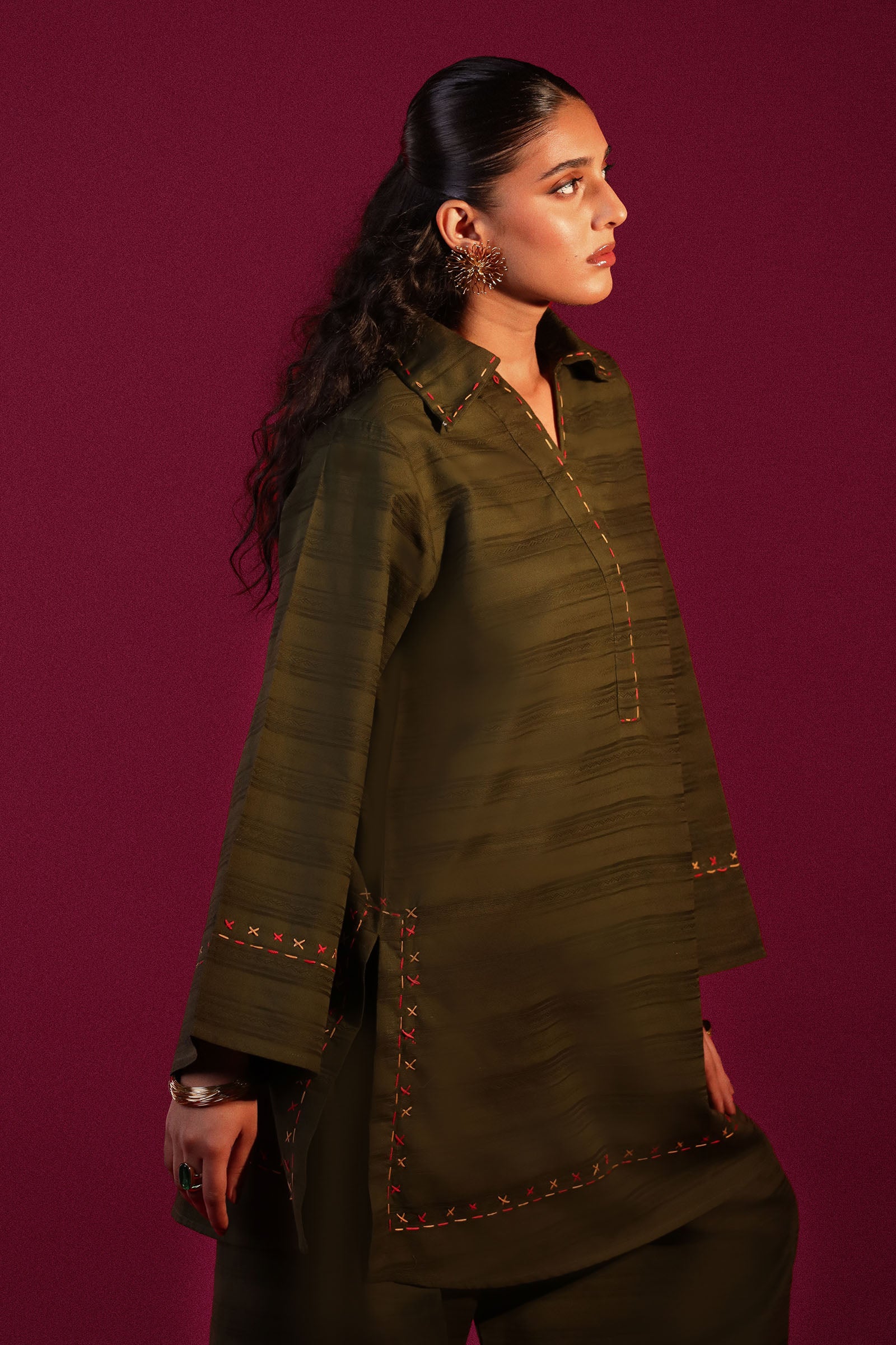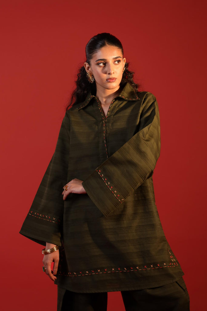 Bathed in the warmth of autumn’s glow, Nayra unfolds in deep forest green jacquard — textured, fluid, and quietly sophisticated. The short shirt and shalwar silhouette move with effortless grace, capturing the serenity of the season.