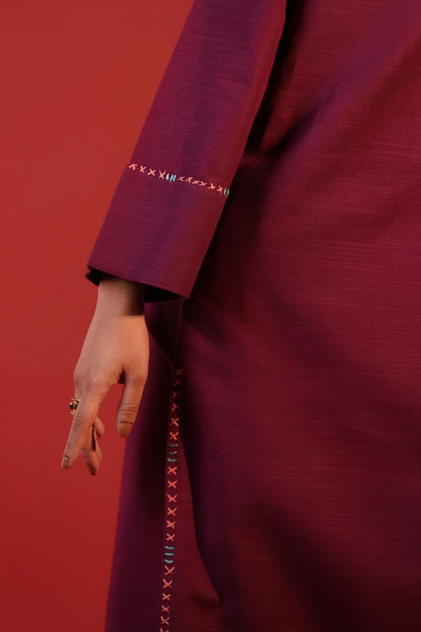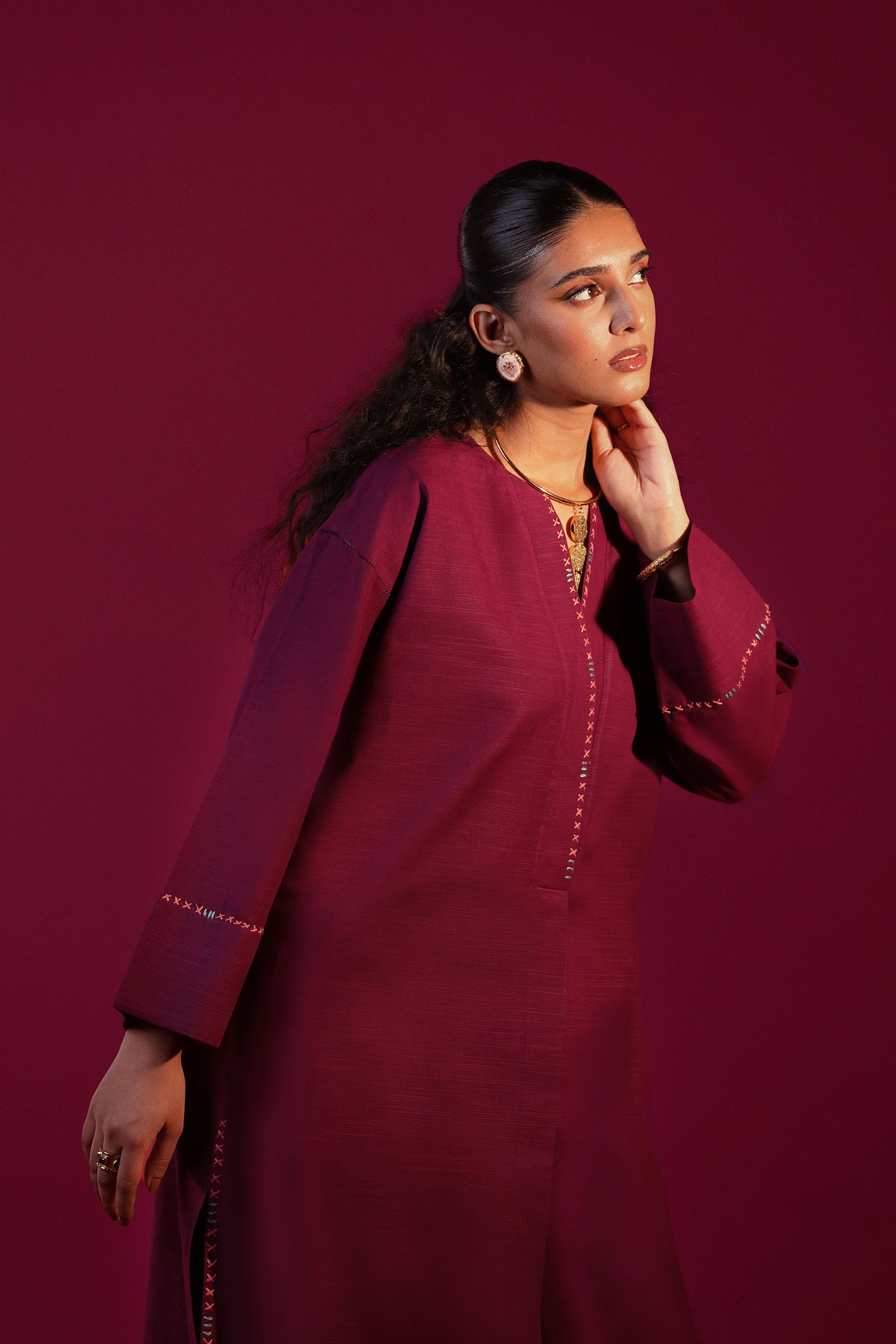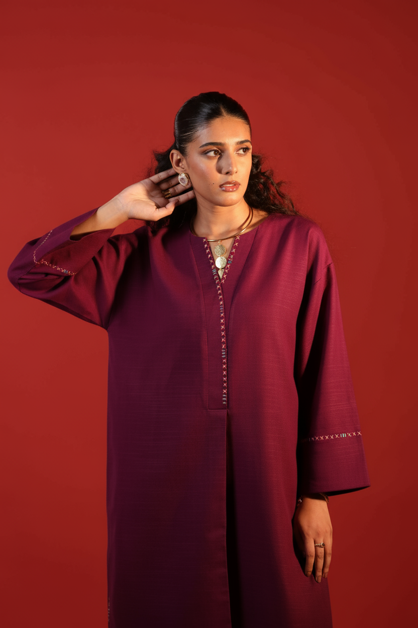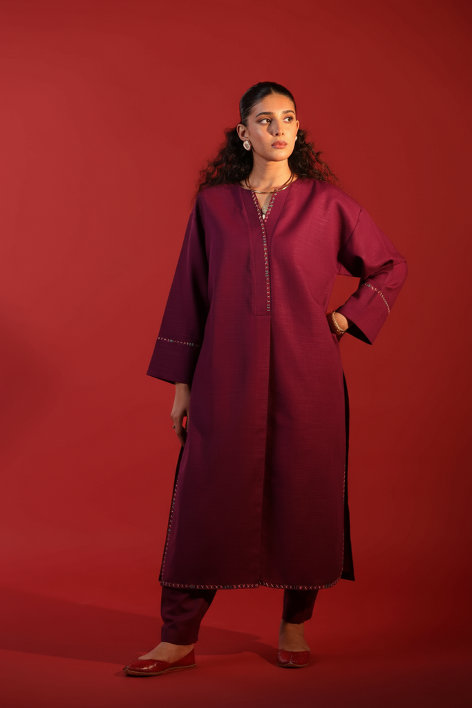 Bathed in the quiet allure of twilight, Oraya moves with fluid grace. Cut from soft khaddar in a deep purple hue, its long, flowing silhouette pairs elegantly with a tapered shalwar — effortless, refined, and endlessly versatile.