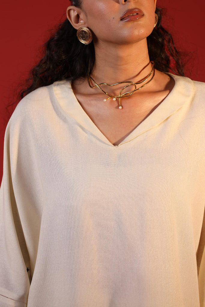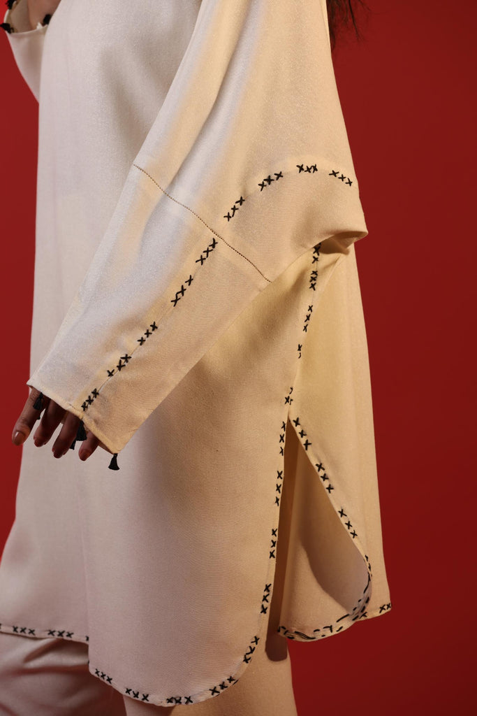 Delicate hand stitches in tones of black and white trace the neckline and sleeves, adding depth and detail to its tranquil palette. Effortless yet refined, Sahen embodies the poetry of fall — serene, modern, and timelessly elegant.